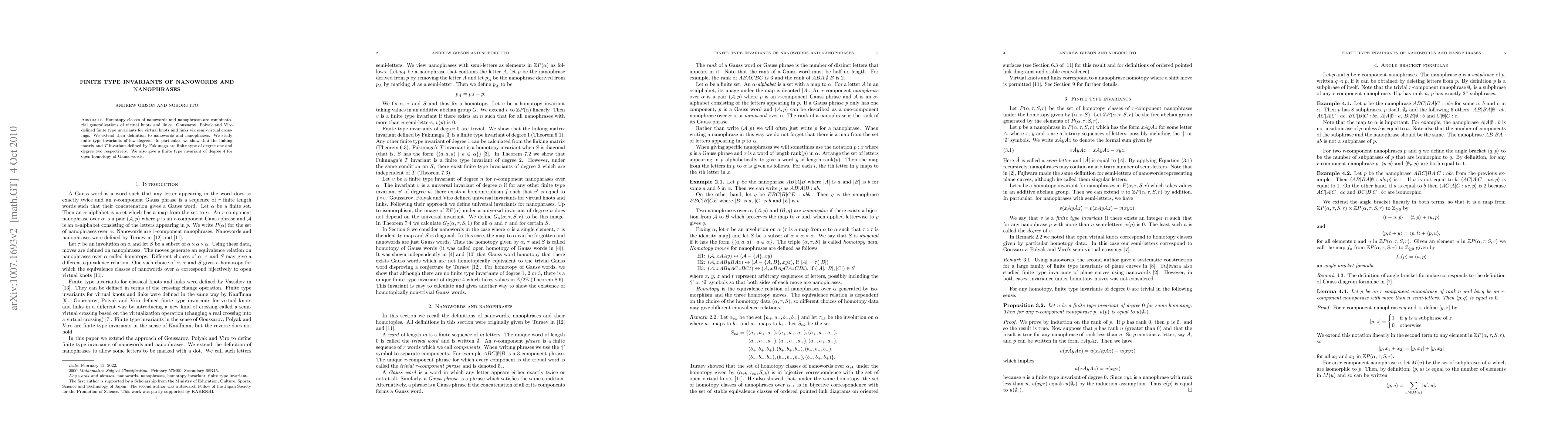 The extension of finite type invariants to nanowords and nanophrases, along with the detailed analysis of low-degree invariants and the definition of Gn(α, τ, S, r) as a group of nanophrases.