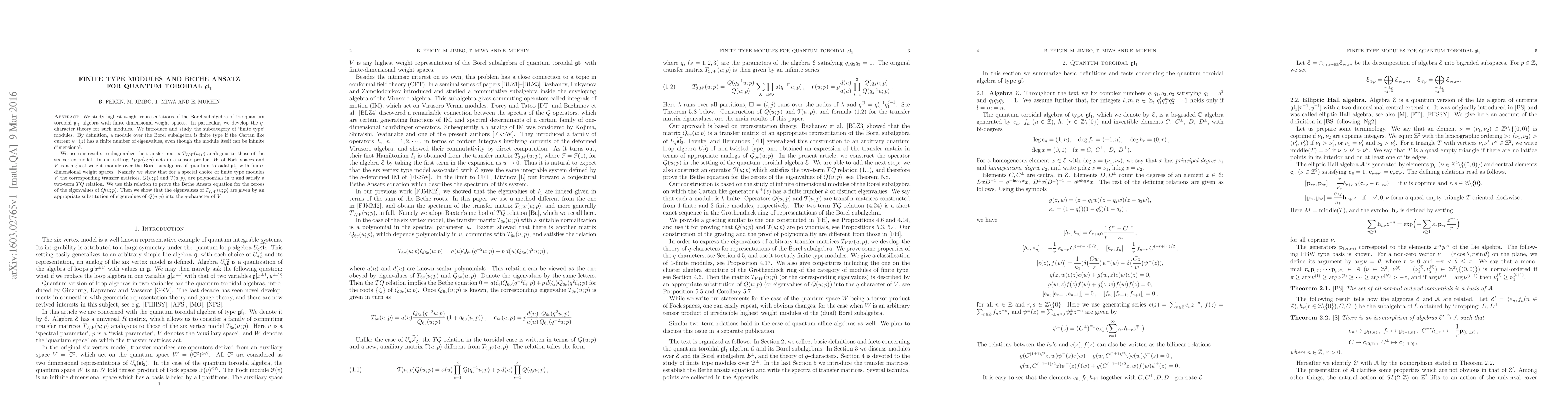 We study highest weight representations of the Borel subalgebra of the quantum toroidal gl(1) algebra with finite-dimensional weight spaces. In particular, we develop the q-character theory for such modules. We introduce and study the subcategory of `finite type' modules. By definition, a module over the Borel subalgebra is finite type if the Cartan like current \psi^+(z) has a finite number of eigenvalues, even though the module itself can be infinite dimensional. We use our results to diagonalize the transfer matrix T_{V,W}(u;p) analogous to those of the six vertex model. In our setting T_{V,W}(u;p) acts in a tensor product W of Fock spaces and V is a highest weight module over the Borel subalgebra of quantum toroidal gl(1) with finite-dimensional weight spaces. Namely we show that for a special choice of finite type modules $V$ the corresponding transfer matrices, Q(u;p) and T(u;p), are polynomials in u and satisfy a two-term TQ relation. We use this relation to prove the Bethe Ansatz equation for the zeroes of the eigenvalues of Q(u;p). Then we show that the eigenvalues of T_{V,W}(u;p) are given by an appropriate substitution of eigenvalues of Q(u;p) into the q-character of V.