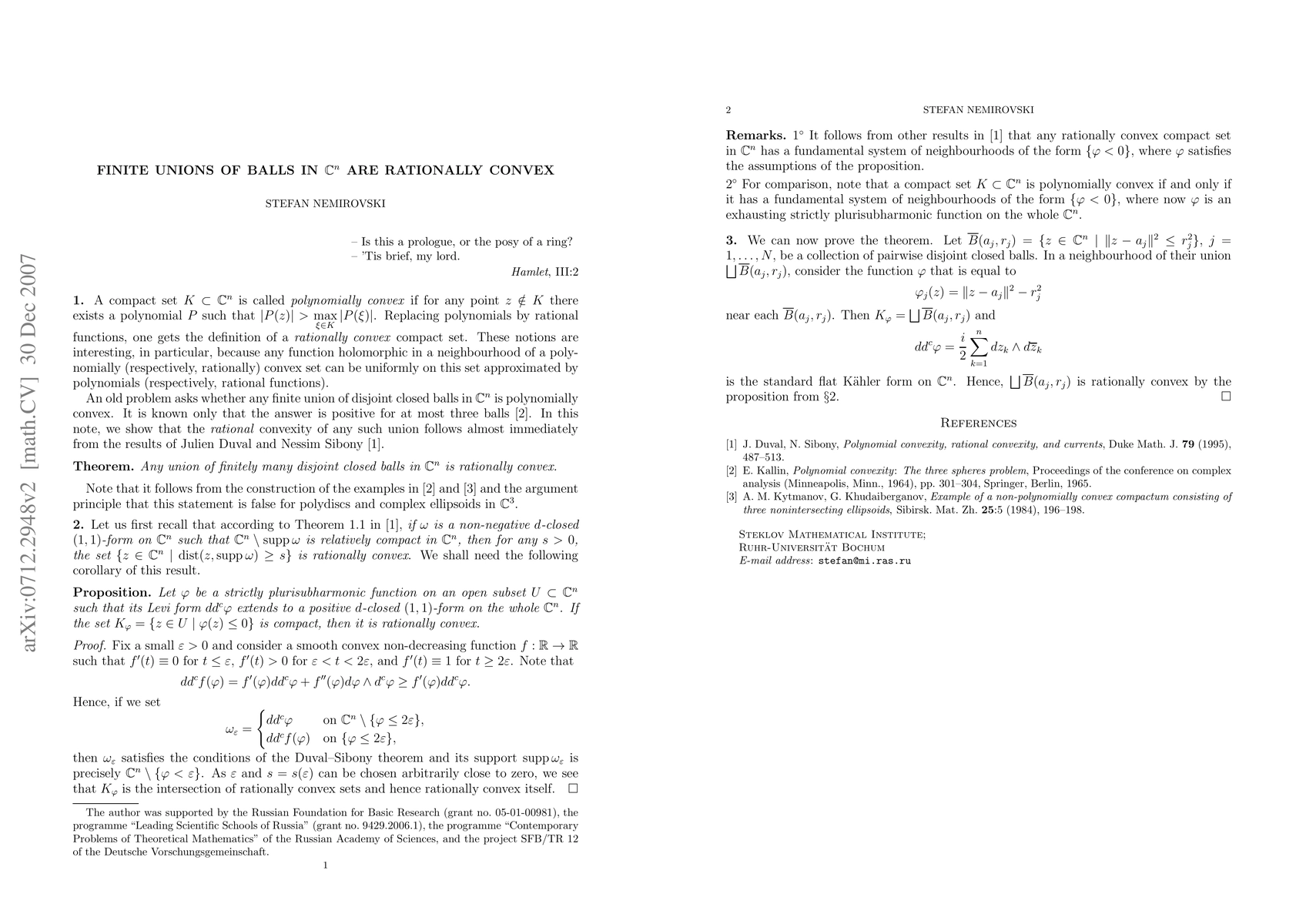 Summary: The paper demonstrates that the rational convexity of any finite union of disjoint closed balls in complex n-space (C^n) can be easily derived from existing results by Duval and Sibony. This establishes a straightforward connection between these unions and rational convexity.