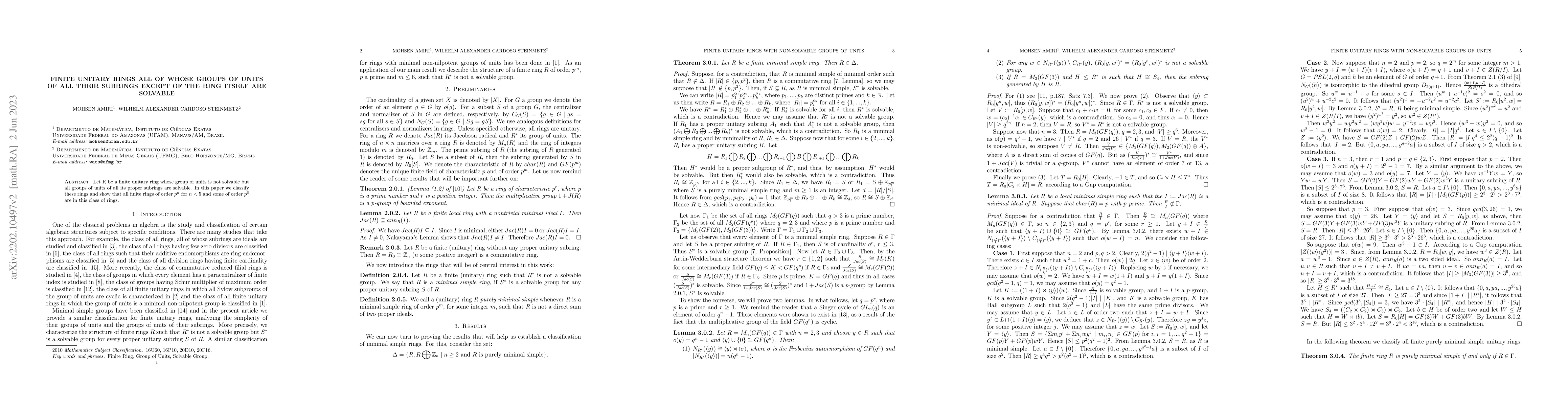 This paper classifies finite unitary rings where the group of units of the ring itself is non-solvable, but all groups of units of its proper subrings are solvable. It finds that such rings include all finite rings of order $p^n$ for $n < 5$ and some of order $p^6$.