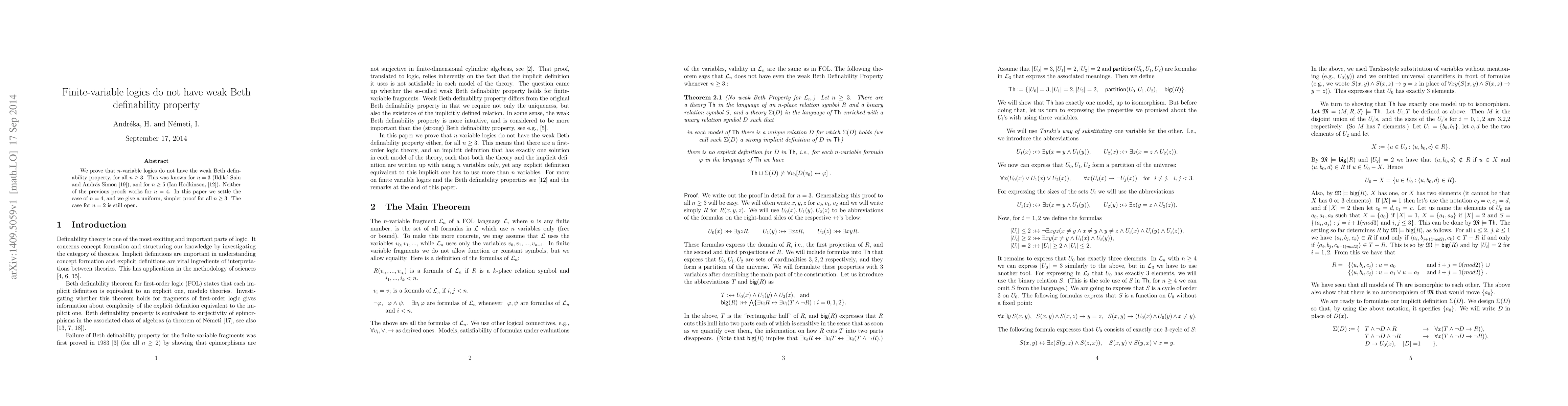 This paper proves that n-variable logics lack the weak Beth definability property for all n greater than 2, providing a uniform and simpler proof for n ≥ 4, and settling the case for n=4. The case for n=2 remains unresolved.