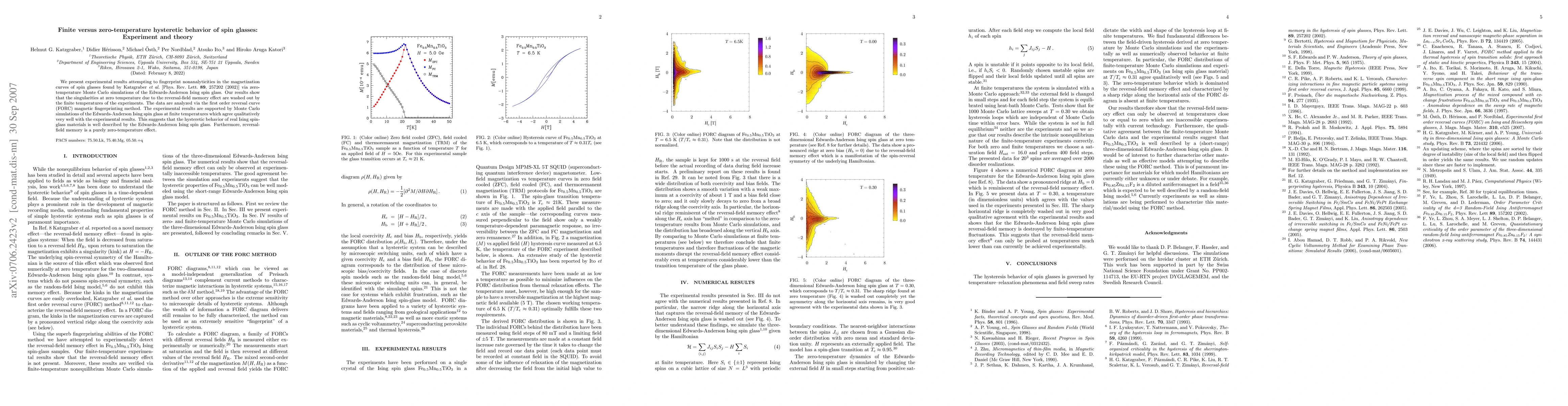 This paper investigates the hysteretic behavior of spin glasses at finite versus zero temperatures, showing that zero-temperature singularities are diminished at higher temperatures. Experimental results using the FORC method and Monte Carlo simulations support that the hysteretic behavior in real materials aligns well with the Edwards-Anderson Ising model, indicating reversal-field memory is a zero-temperature phenomenon.