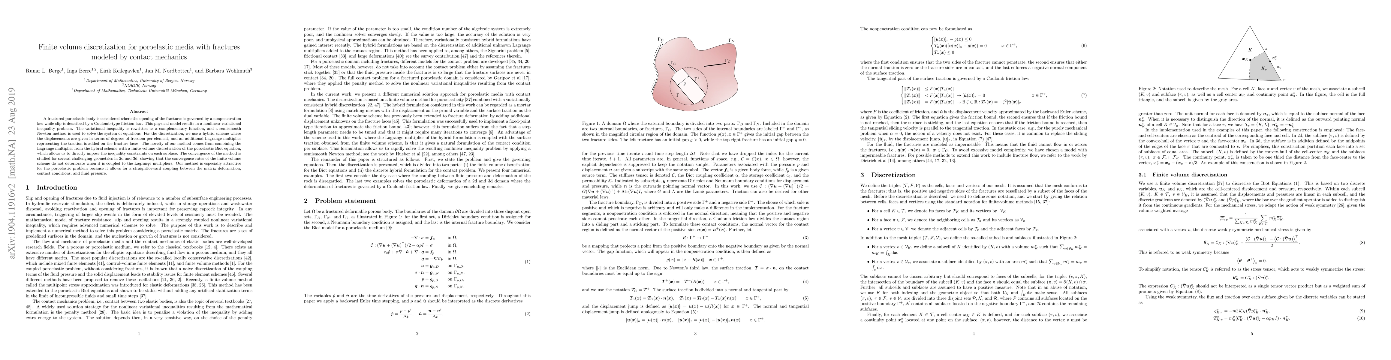 A fractured poroelastic body is considered where the opening of the fractures is governed by a nonpenetration law while slip is described by a Coulomb-type friction law. This physical model results in a nonlinear variational inequality problem. The variational inequality is rewritten as a complimentary function, and a semismooth Newton method is used to solve the system of equations. For the discretization, we use a hybrid scheme where the displacements are given in terms of degrees of freedom per element, and an additional Lagrange multiplier representing the traction is added on the fracture faces. The novelty of our method comes from combining the Lagrange multiplier from the hybrid scheme with a finite volume discretization of the poroelastic Biot equation, which allows us to directly impose the inequality constraints on each subface. The convergence of the method is studied for several challenging geometries in 2d and 3d, showing that the convergence rates of the finite volume scheme do not deteriorate when it is coupled to the Lagrange multipliers. Our method is especially attractive for the poroelastic problem because it allows for a straightforward coupling between the matrix deformation, contact conditions, and fluid pressure.