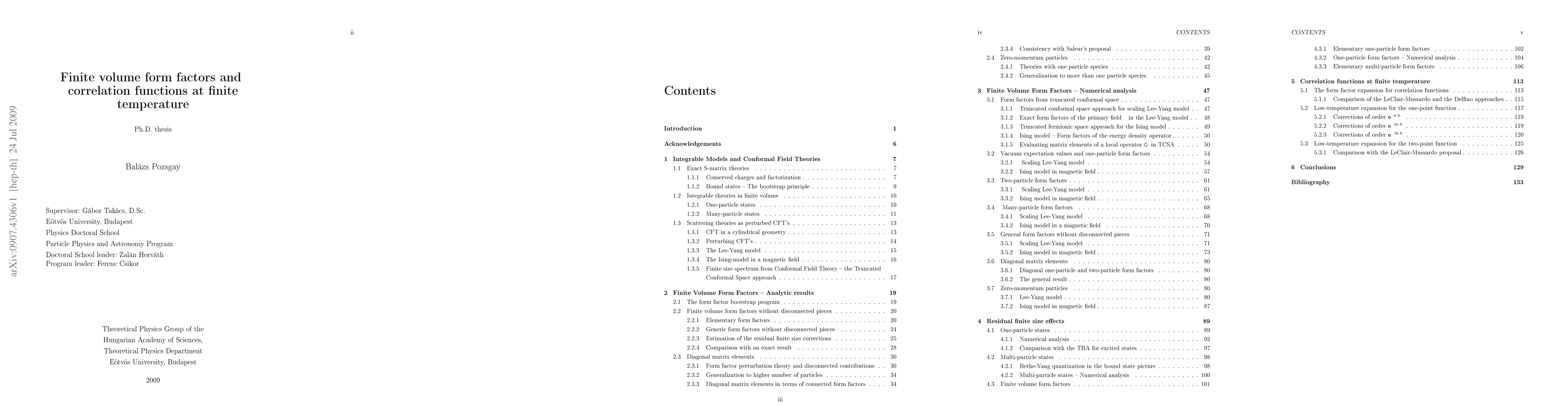 This thesis investigates finite size effects in 1+1 dimensional integrable quantum field theories (QFT) by analyzing finite volume form factors and correlation functions at finite temperature. It provides a complete description of finite volume form factors in terms of infinite volume form factors and the S-matrix, and derives a systematic low-temperature expansion for correlation functions using finite volume factors.