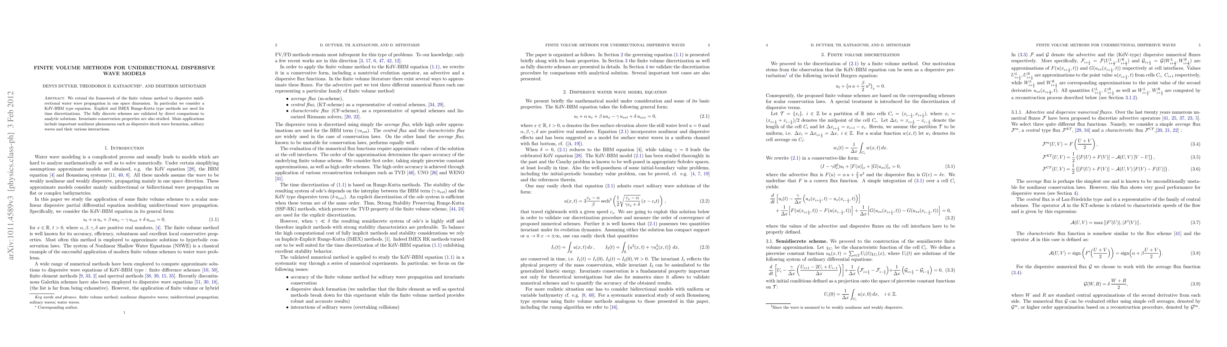 This paper extends the finite volume method to model dispersive wave propagation in unidirectional water waves, focusing on KdV-BBM type equations. It employs explicit and IMEX Runge-Kutta methods for time discretization and validates the schemes against analytic solutions, while also studying invariants conservation properties and applications to phenomena like dispersive shock waves and solitary wave interactions.