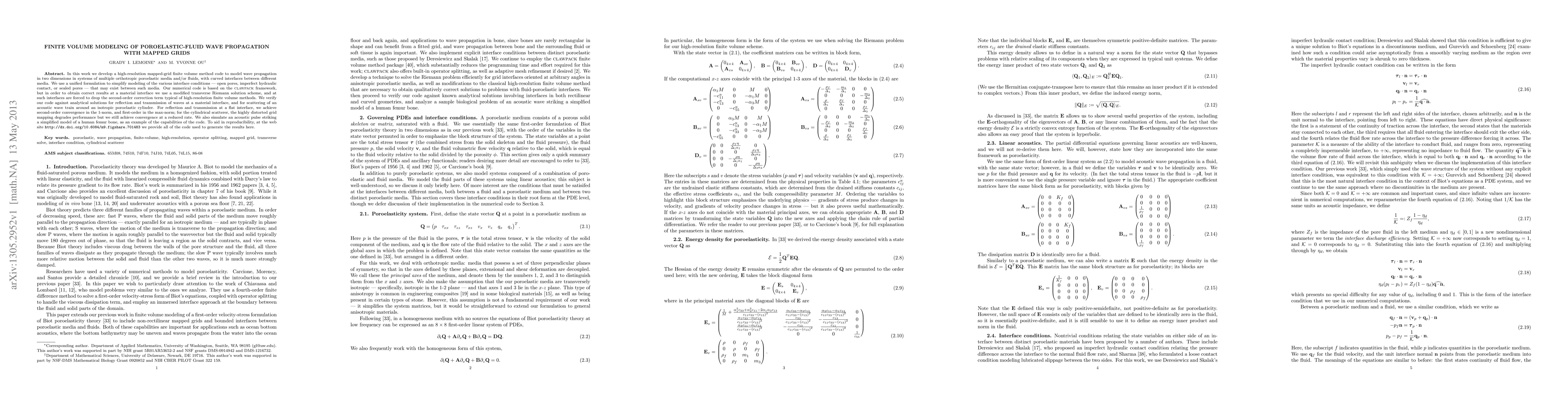 In this work we develop a high-resolution mapped-grid finite volume method code to model wave propagation in two dimensions in systems of multiple orthotropic poroelastic media and/or fluids, with curved interfaces between different media. We use a unified formulation to simplify modeling of the various interface conditions -- open pores, imperfect hydraulic contact, or sealed pores -- that may exist between such media. Our numerical code is based on the Clawpack framework, but in order to obtain correct results at a material interface we use a modified transverse Riemann solution scheme, and at such interfaces are forced to drop the second-order correction term typical of high-resolution finite volume methods. We verify our code against analytical solutions for reflection and transmission of waves at a material interface, and for scattering of an acoustic wave train around an isotropic poroelastic cylinder. For reflection and transmission at a flat interface, we achieve second-order convergence in the 1-norm, and first-order in the max-norm; for the cylindrical scatterer, the highly distorted grid mapping degrades performance but we still achieve convergence at a reduced rate. We also simulate an acoustic pulse striking a simplified model of a human femur bone, as an example of the capabilities of the code. To aid in reproducibility, at the web site http://dx.doi.org/10.6084/m9.figshare.701483 we provide all of the code used to generate the results here.