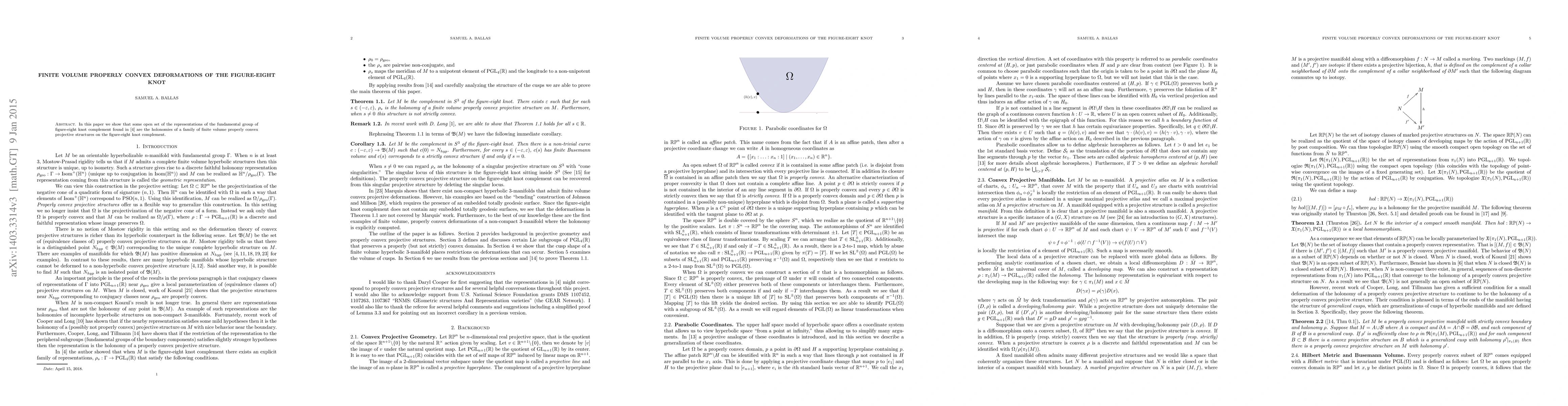 Summary: This research demonstrates that a subset of representations from the figure-eight knot's fundamental group corresponds to holonomies of finite volume properly convex projective structures on its complement. These structures are linked to deformations within the knot's complement.