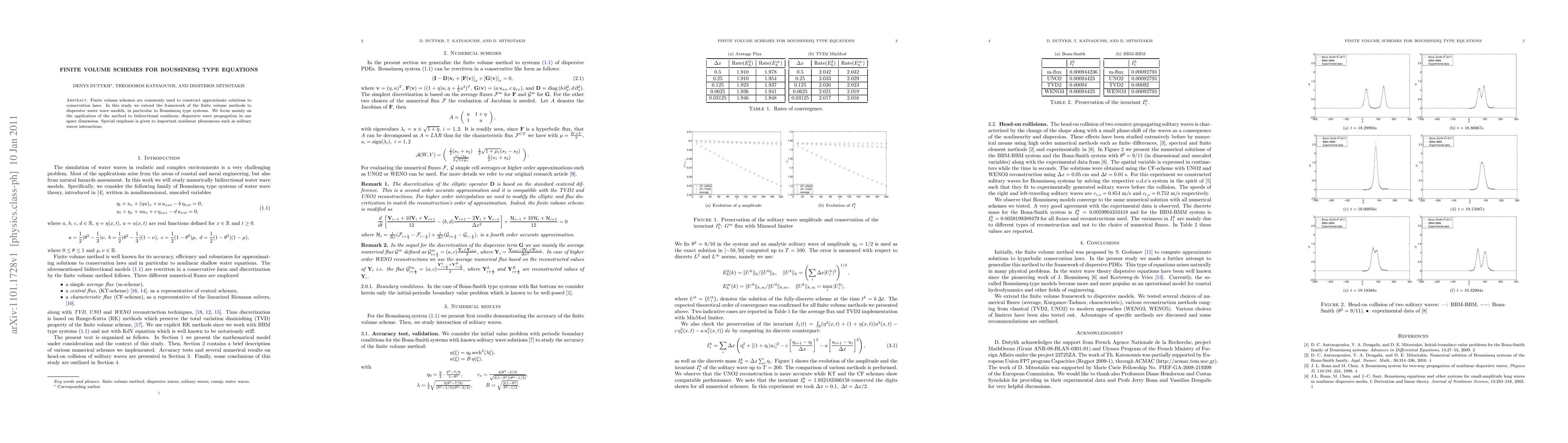 This paper develops finite volume schemes for solving Boussinesq type equations, which model dispersive water wave phenomena. The study focuses on bidirectional nonlinear wave propagation and highlights the method's application to solitary wave interactions.
