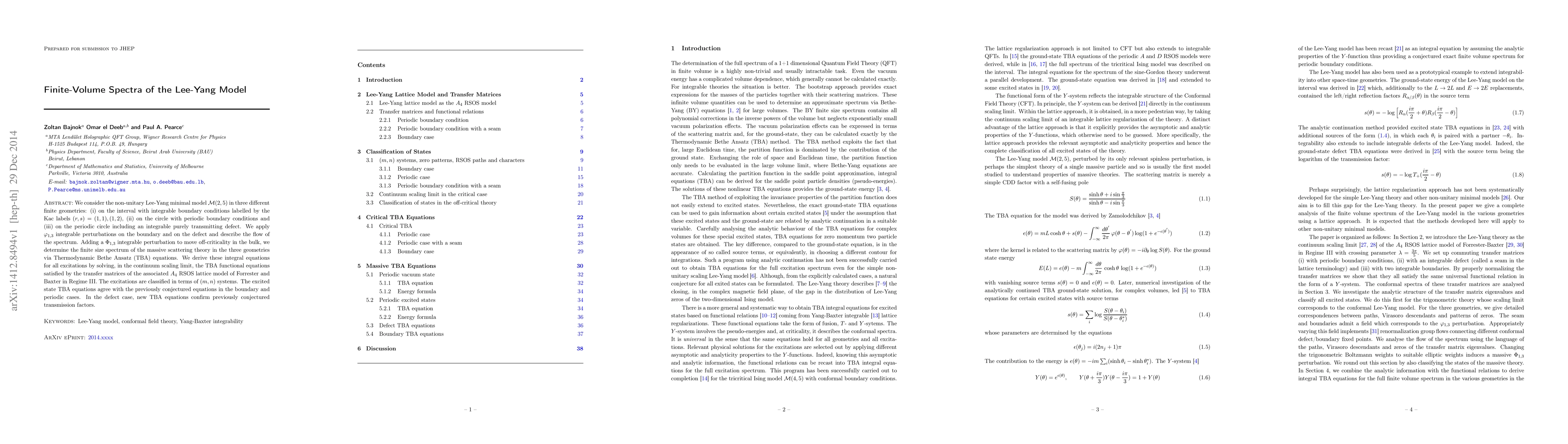 We consider the non-unitary Lee-Yang minimal model ${\cal M}(2,5)$ in three different finite geometries: (i) on the interval with integrable boundary conditions labelled by the Kac labels $(r,s)=(1,1),(1,2)$, (ii) on the circle with periodic boundary conditions and (iii) on the periodic circle including an integrable purely transmitting defect. We apply $\varphi_{1,3}$ integrable perturbations on the boundary and on the defect and describe the flow of the spectrum. Adding a $\Phi_{1,3}$ integrable perturbation to move off-criticality in the bulk, we determine the finite size spectrum of the massive scattering theory in the three geometries via Thermodynamic Bethe Ansatz (TBA) equations. We derive these integral equations for all excitations by solving, in the continuum scaling limit, the TBA functional equations satisfied by the transfer matrices of the associated $A_{4}$ RSOS lattice model of Forrester and Baxter in Regime III. The excitations are classified in terms of $(m,n)$ systems. The excited state TBA equations agree with the previously conjectured equations in the boundary and periodic cases. In the defect case, new TBA equations confirm previously conjectured transmission factors.