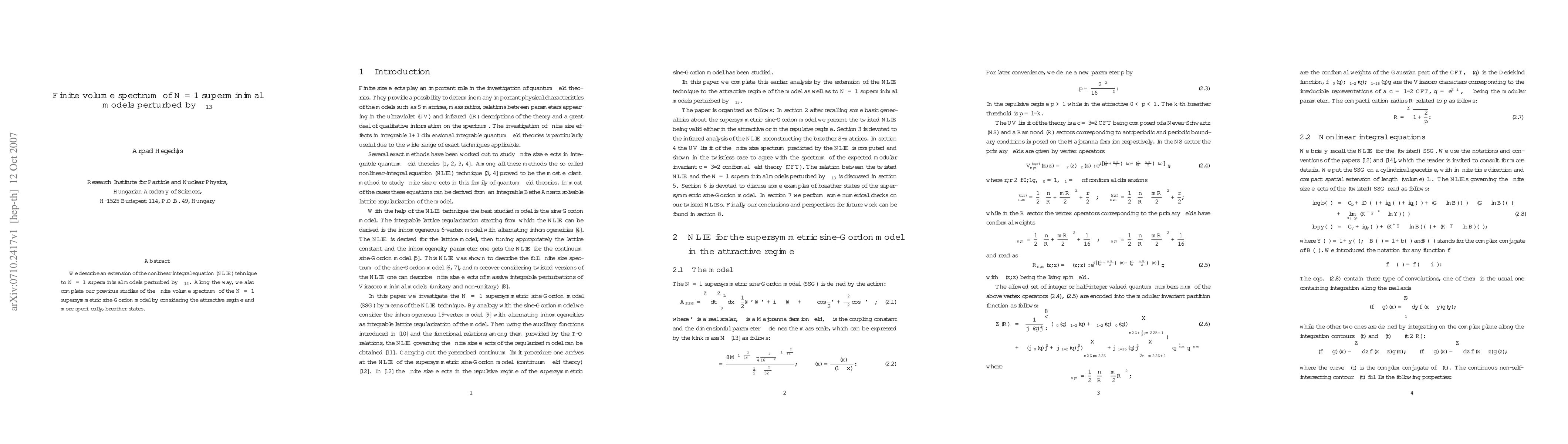 We describe an extension of the nonlinear integral equation (NLIE) tehnique to N=1 superminimal models perturbed by $\Phi_{13}$. Along the way, we also complete our previous studies of the finite volume spectrum of the N=1 supersymmetric sine-Gordon model by considering the attractive regime and more specifically, breather states.