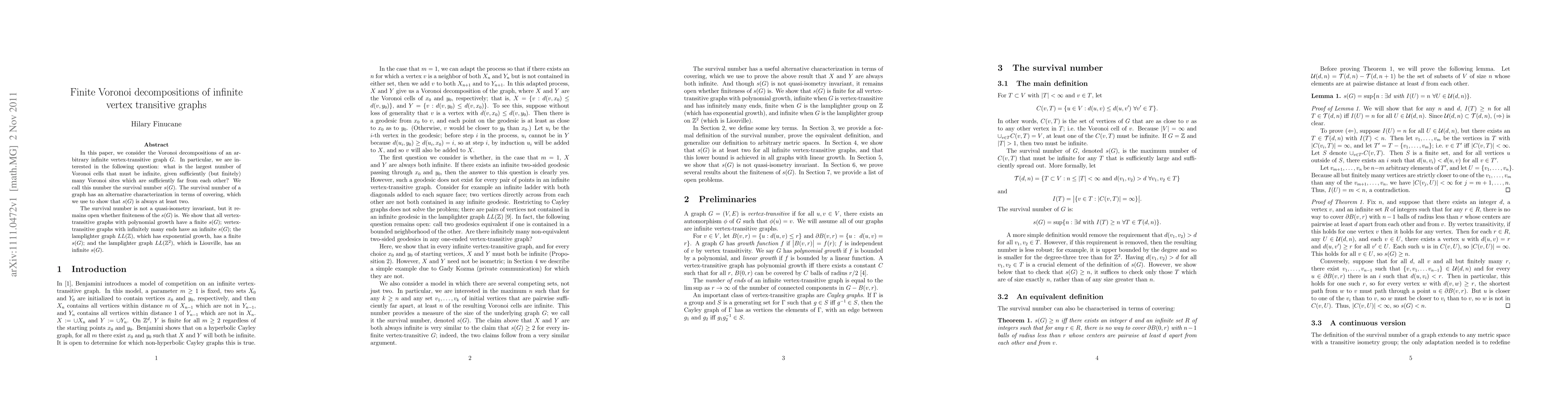 In this paper, we consider the Voronoi decompositions of an arbitrary infinite vertex-transitive graph G. In particular, we are interested in the following question: what is the largest number of Voronoi cells that must be infinite, given sufficiently (but finitely) many Voronoi sites which are sufficiently far from each other? We call this number the survival number s(G). The survival number of a graph has an alternative characterization in terms of covering, which we use to show that s(G) is always at least two. The survival number is not a quasi-isometry invariant, but it remains open whether finiteness of the s(G) is. We show that all vertex transitive graphs with polynomial growth have a finite s(G); vertex transitive graphs with infinitely many ends have an infinite s(G); the lamplighter graph LL(Z), which has exponential growth, has a finite s(G); and the lamplighter graph LL(Z^2), which is Liouville, has an infinite s(G).