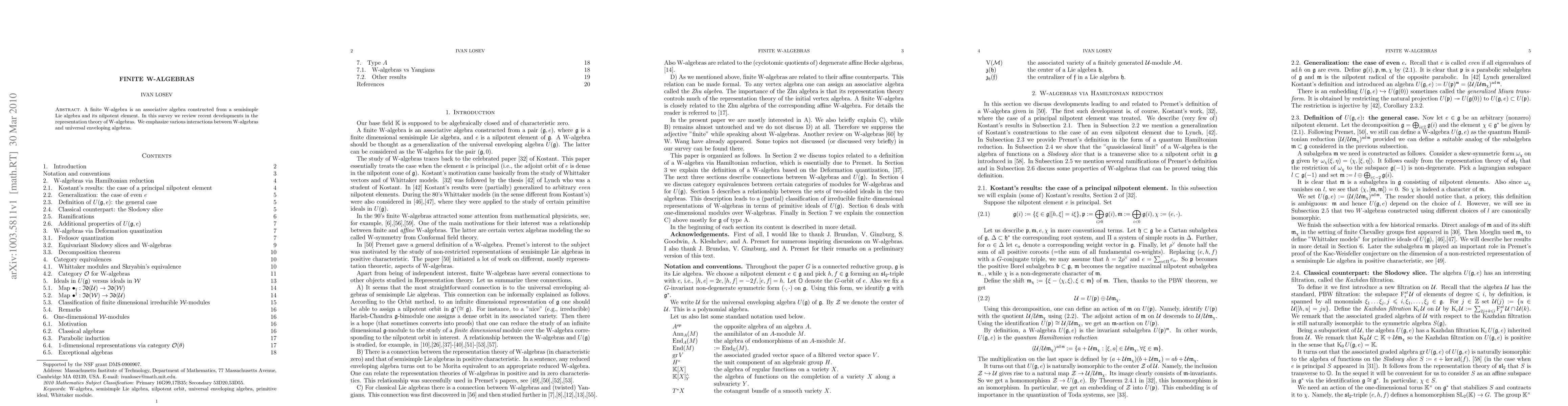 A finite W-algebra is an associative algebra constructed from a semisimple Lie algebra and its nilpotent element. In this survey we review recent developments in the representation theory of W-algebras. We emphasize various interactions between W-algebras and universal enveloping algebras.