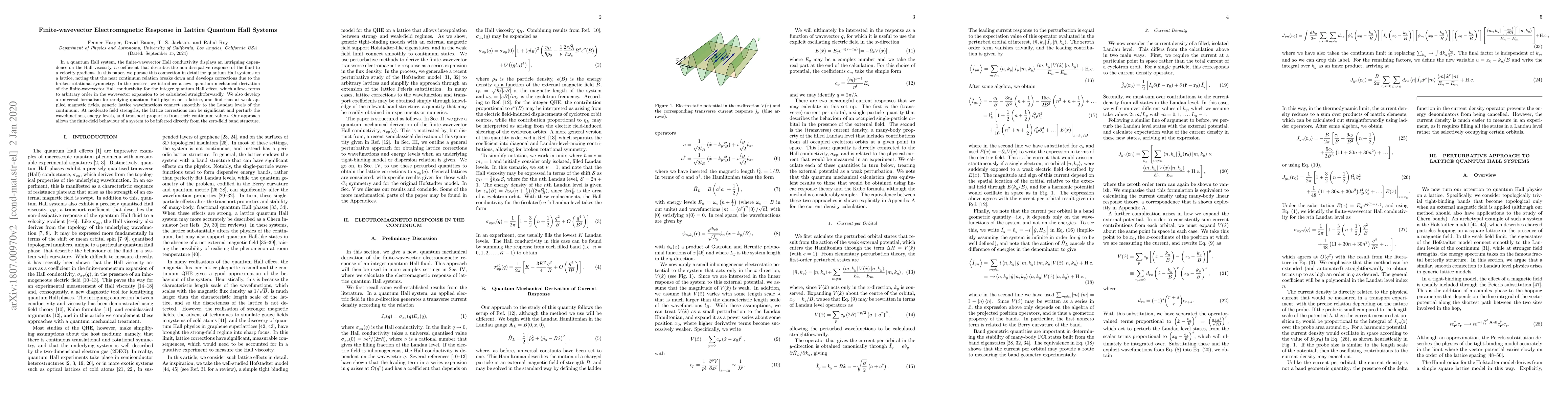 In a quantum Hall system, the finite-wavevector Hall conductivity displays an intriguing dependence on the Hall viscosity, a coefficient that describes the non-dissipative response of the fluid to a velocity gradient. In this paper, we pursue this connection in detail for quantum Hall systems on a lattice, noting that the neat continuum relation breaks down and develops corrections due to the broken rotational symmetry. In the process, we introduce a new, quantum mechanical derivation of the finite-wavevector Hall conductivity for the integer quantum Hall effect, which allows terms to arbitrary order in the wavevector expansion to be calculated straightforwardly. We also develop a universal formalism for studying quantum Hall physics on a lattice, and find that at weak applied magnetic fields, generic lattice wavefunctions connect smoothly to the Landau levels of the continuum. At moderate field strengths, the lattice corrections can be significant and perturb the wavefunctions, energy levels, and transport properties from their continuum values. Our approach allows the finite-field behaviour of a system to be inferred directly from the zero-field band structure.