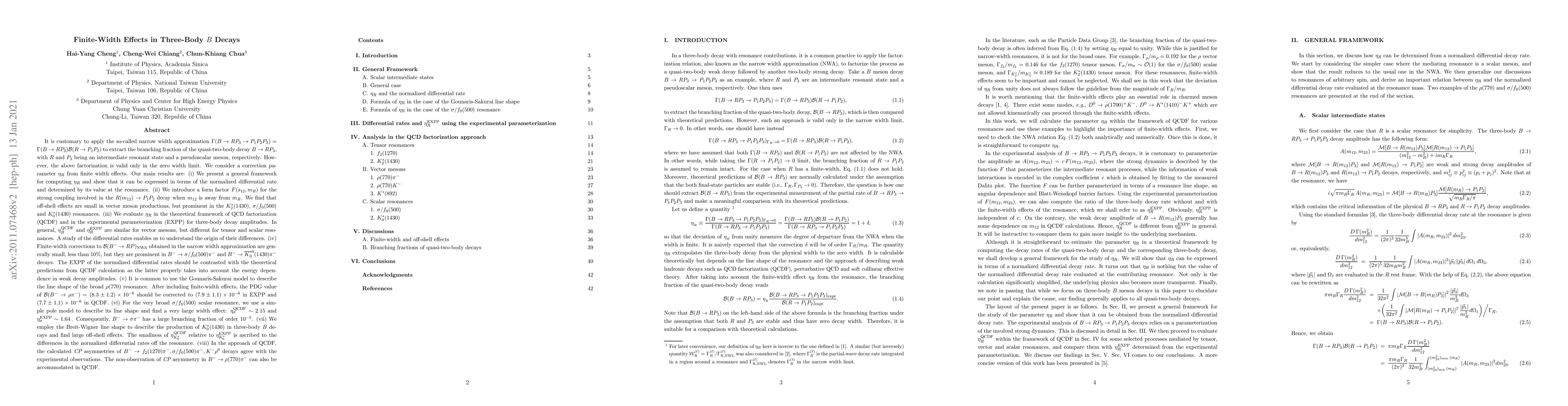 It is customary to apply the so-called narrow width approximation $\Gamma(B\to RP_3\to P_1P_2P_3)=\Gamma(B\to RP_3)Br(R\to P_1P_2)$ to extract the branching fraction of the quasi-two-body decay $B\to RP_3$, with $R$ and $P_3$ being an intermediate resonant state and a pseudoscalar meson, respectively. However, the above factorization is valid only in the zero width limit. We consider a correction parameter $\eta_R$ from finite width effects. Our main results are: (i) We present a general framework for computing $\eta_R$ and show that it can be expressed in terms of the normalized differential rate and determined by its value at the resonance. (ii) We introduce a form factor $F(s_{12},m_R)$ for the strong coupling involved in the $R(m_{12})\to P_1P_2$ decay when $m_{12}$ is away from $m_R$. We find that off-shell effects are small in vector meson productions, but prominent in the $K_2^*(1430)$, $\sigma/f_0(500)$ and $K_0^*(1430)$ resonances. (iii) We evaluate $\eta_R$ in the theoretical framework of QCD factorization (QCDF) and in the experimental parameterization (EXPP) for three-body decay amplitudes. In general, $\eta_R^{\rm QCDF}$ and $\eta_R^{\rm EXPP}$ are similar for vector mesons, but different for tensor and scalar resonances. A study of the differential rates enables us to understand the origin of their differences. (iv) Finite-width corrections to $Br(B^-\to RP)_{\rm NWA}$ obtained in the narrow width approximation are generally small, less than 10\%, but they are prominent in $B^-\to\sigma/f_0(500)\pi^-$ and $B^-\to \overline K_0^{*0}(1430)\pi^-$ decays. The EXPP of the normalized differential rates should be contrasted with the theoretical predictions from QCDF calculation as the latter properly takes into account the energy dependence in weak decay amplitudes.