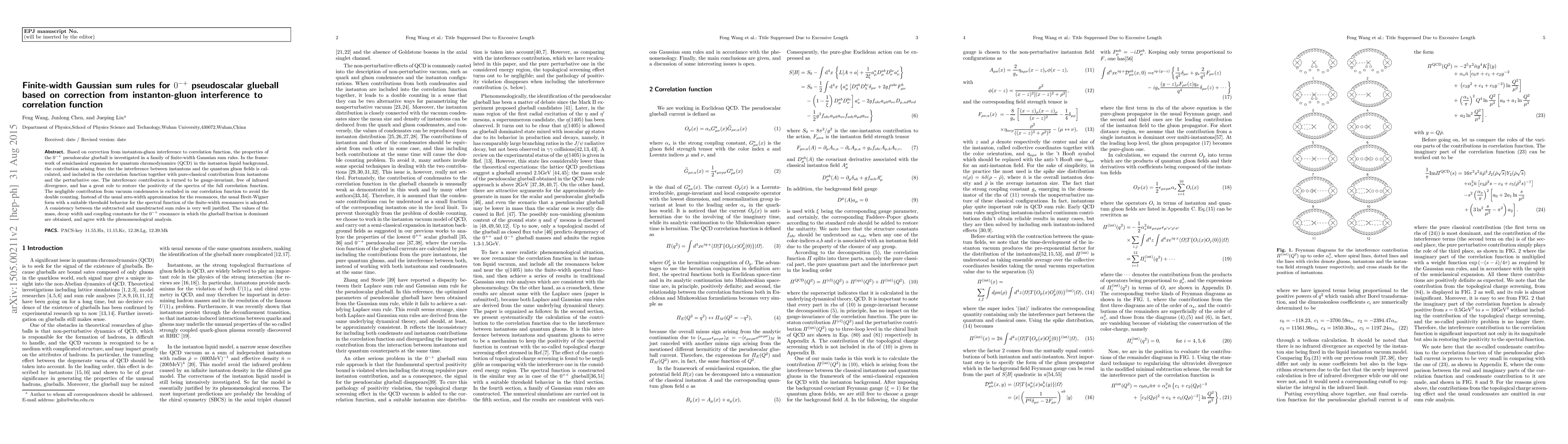 Based on correction from instanton-gluon interference to correlation function, the properties of the $0^{-+}$ pseudoscalar glueball is investigated in a family of finite-width Gaussian sum rules. In the framework of semiclassical expansion for quantum chromodynamics $(\textrm{QCD})$ in the instanton liquid background, the contribution arising from the the interference between instantons and the quantum gluon fields is calculated, and included in the correlation function together with pure-classical contribution from instantons and the perturbative one. The interference contribution is turned to be gauge-invariant, free of infrared divergence, and has a great role to restore the positivity of the spectra of the full correlation function. The negligible contribution from vacuum condensates is excluded in our correlation function to avoid the double counting. Instead of the usual zero-width approximation for the resonances, the usual Breit-Wigner form with a suitable threshold behavior for the spectral function of the finite-width resonances is adopted. A consistency between the subtracted and unsubtracted sum rules is very well justified. The values of the mass, decay width and coupling constants for the $0^{-+}$ resonance in which the glueball fraction is dominant are obtained, and agree with the phenomenological analysis.