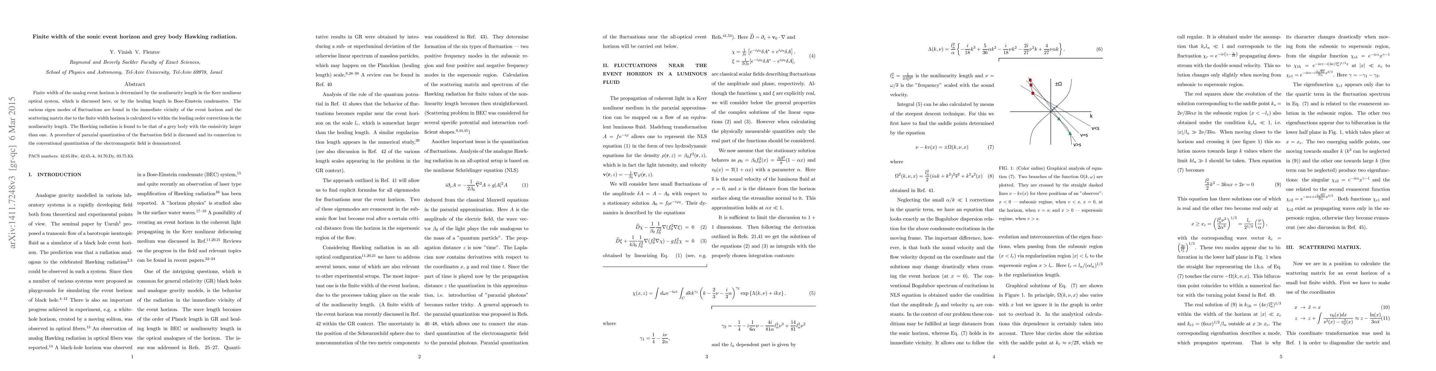 This paper investigates the finite width of the sonic event horizon in nonlinear optical systems and Bose-Einstein condensates, determining it by the nonlinearity length or healing length. It calculates the scattering matrix for fluctuations near the horizon and finds the Hawking radiation to be a grey body with emissivity greater than one, linking paraxial quantization to conventional electromagnetic field quantization.