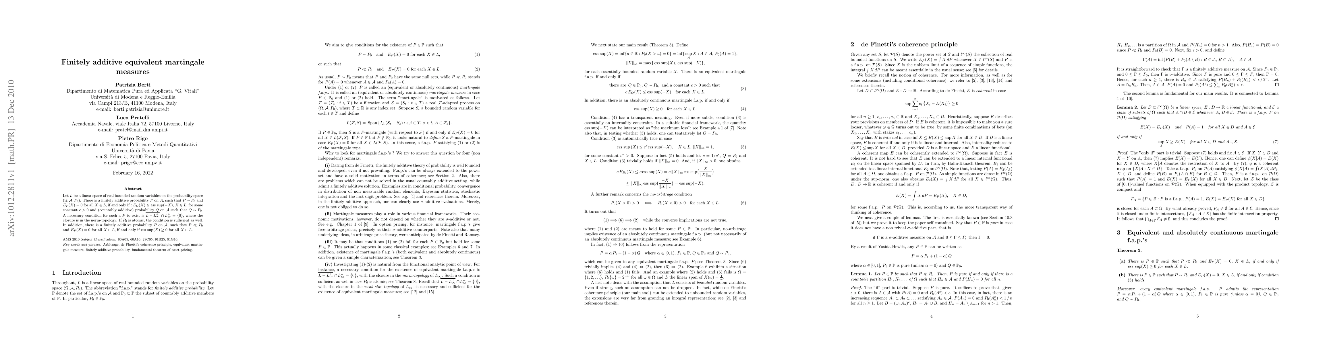 Let $L$ be a linear space of real bounded random variables on the probability space $(\Omega,\mathcal{A},P_0)$. There is a finitely additive probability $P$ on $\mathcal{A}$, such that $P\sim P_0$ and $E_P(X)=0$ for all $X\in L$, if and only if $c\,E_Q(X)\leq\text{ess sup}(-X)$, $X\in L$, for some constant $c>0$ and (countably additive) probability $Q$ on $\mathcal{A}$ such that $Q\sim P_0$. A necessary condition for such a $P$ to exist is $\bar{L-L_\infty^+}\,\cap L_\infty^+=\{0\}$, where the closure is in the norm-topology. If $P_0$ is atomic, the condition is sufficient as well. In addition, there is a finitely additive probability $P$ on $\mathcal{A}$, such that $P\ll P_0$ and $E_P(X)=0$ for all $X\in L$, if and only if $\text{ess sup}(X)\geq 0$ for all $X\in L$.