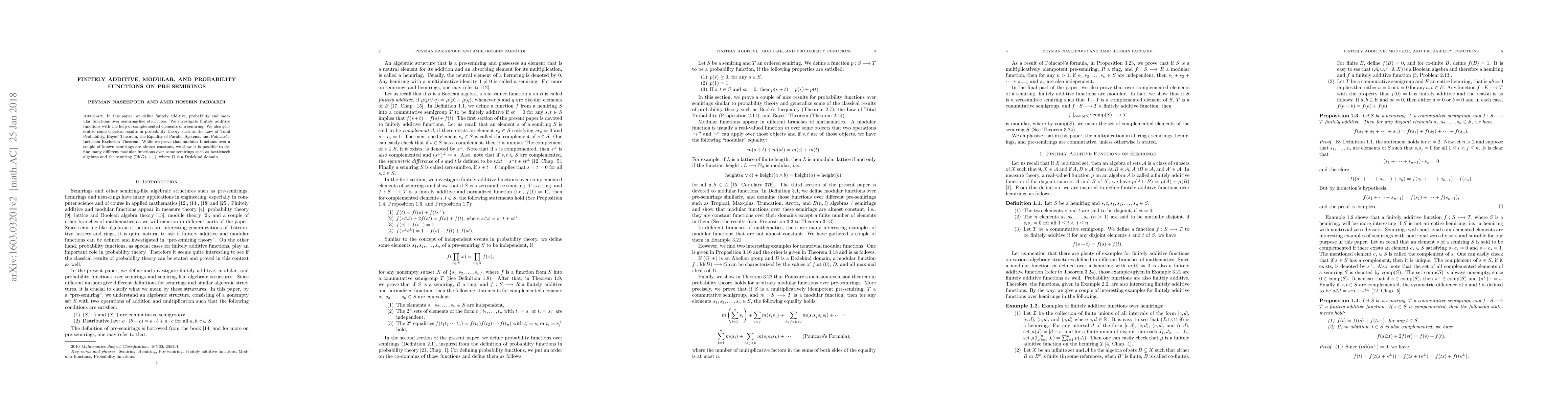 The paper introduces a framework for defining and analyzing finitely additive, probability, and modular functions on pre-semirings, along with generalizations of classical probability theory results.
