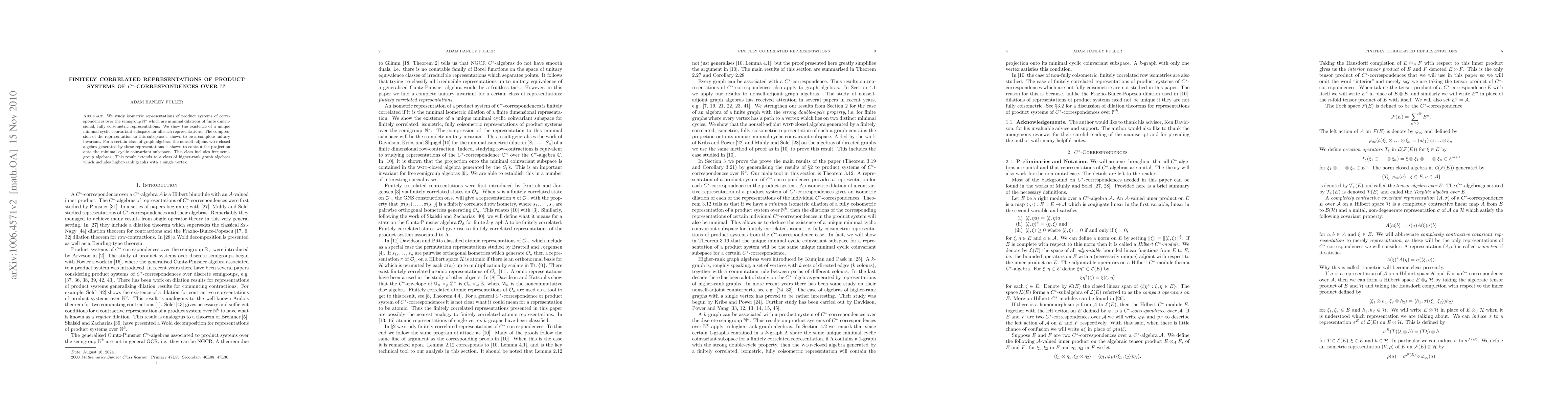 We study isometric representations of product systems of correspondences over the semigroup $\mathbb{N}^k$ which are minimal dilations of finite dimensional, fully coisometric representations. We show the existence of a unique minimal cyclic coinvariant subspace for all such representations. The compression of the representation to this subspace is shown to be complete unitary invariant. For a certain class of graph algebras the nonself-adjoint \textsc{wot}-closed algebra generated by these representations is shown to contain the projection onto the minimal cyclic coinvariant subspace. This class includes free semigroup algebras. This result extends to a class of higher-rank graph algebras which includes higher-rank graphs with a single vertex.
