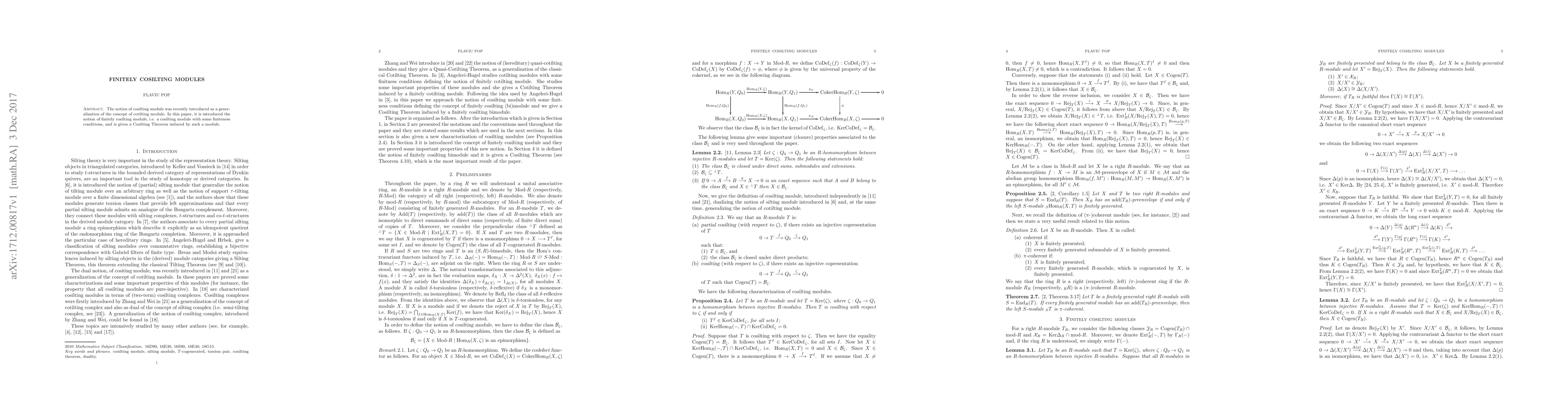 This paper introduces the concept of finitely cosilting modules, which generalize cosilting modules with additional finiteness conditions, and explores their properties, culminating in a significant Cosilting Theorem derived from these modules.