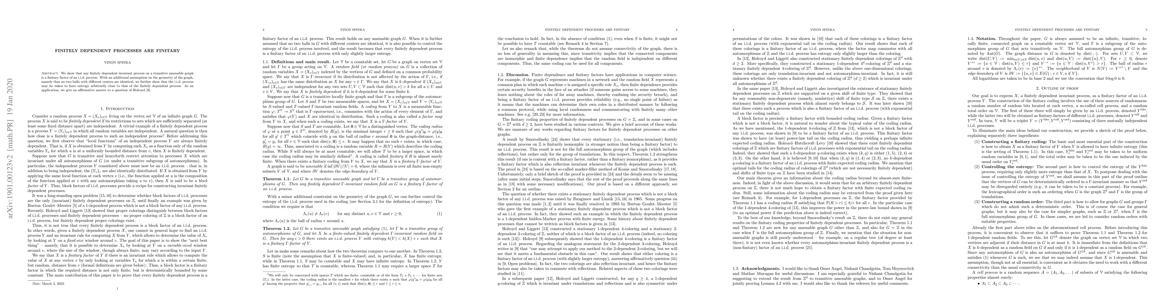 This paper demonstrates that finitely dependent invariant processes on transitive amenable graphs are finitary factors of i.i.d. processes. Under the condition that no two balls with different centers are identical, the i.i.d. process can have entropy arbitrarily close to the original process, addressing a question posed by Holroyd.