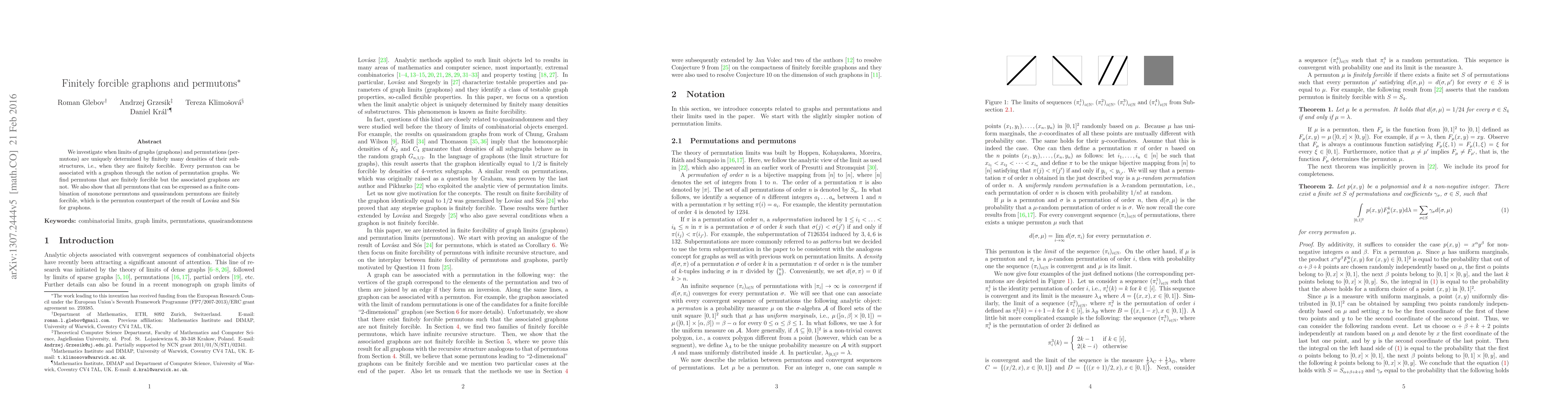 This paper explores the concept of finitely forcible graphons and permutons, determining when these limits are uniquely identified by a finite number of substructure densities. It reveals that while some permutons are finitely forcible, their associated graphons are not, and establishes that permutons formed by finite combinations of monotone and quasirandom permutons are finitely forcible, analogous to a known result for graphons.