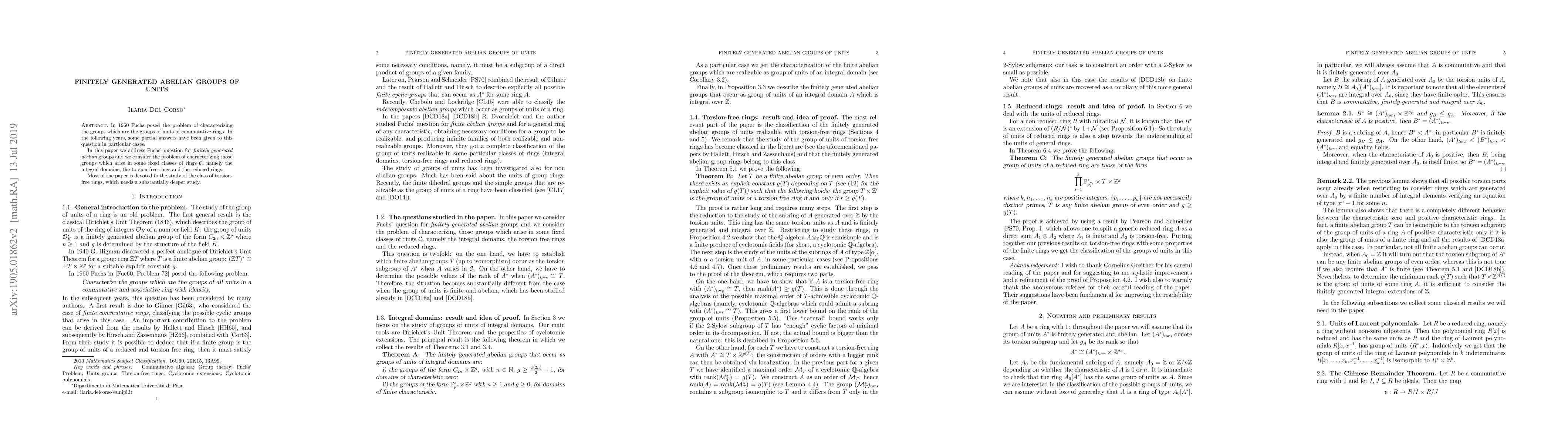 This paper characterizes finitely generated abelian groups that can be the groups of units in integral domains, torsion-free rings, and reduced rings, addressing Fuchs' 1960 problem. It focuses on determining which finite abelian groups can occur as torsion subgroups and the possible ranks of these groups within specified classes of rings.