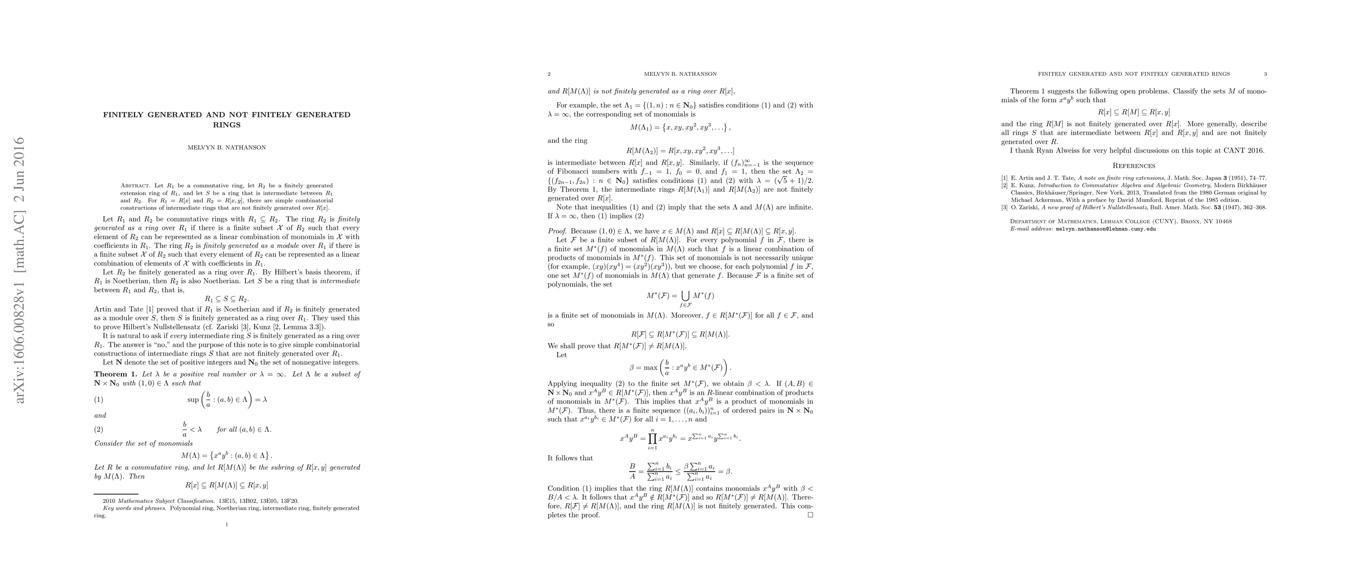 Let $R_1$ be a commutative ring, let $R_2$ be a finitely generated extension ring of $R_1$, and let $S$ be a ring that is intermediate between $R_1$ and $R_2$. For $R_1 = R[x]$ and $R_2 = R[x,y]$, this paper gives simple combinatorial constructions of intermediate rings $S$ that are not finitely generated over $R[x]$.