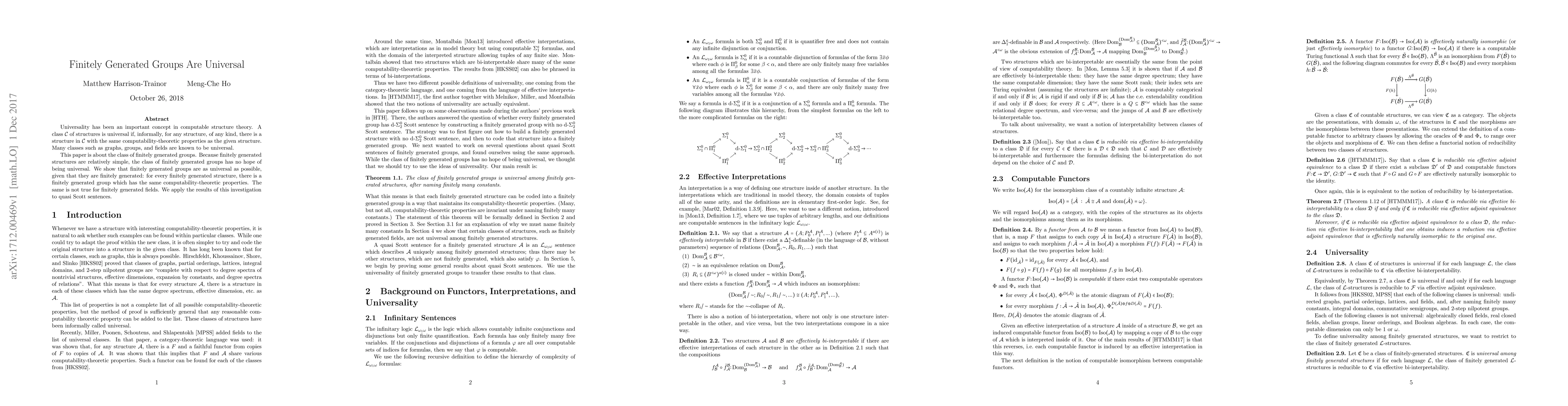 Summary: This paper demonstrates that the class of finitely generated groups is universal in terms of computability-theoretic properties, meaning every finitely generated structure can be mimicked by a finitely generated group. This result contrasts with the non-universality of finitely generated fields and is applied to quasi Scott sentences.