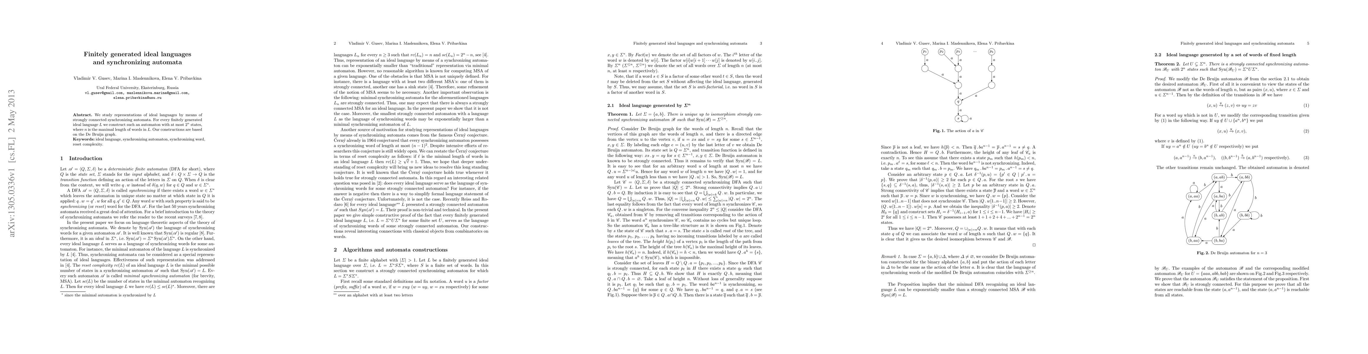 This paper investigates the representation of finitely generated ideal languages using strongly connected synchronizing automata, constructing such automata with at most 2^n states, where n is the maximal length of words in the language, utilizing De Bruijn graph constructions.