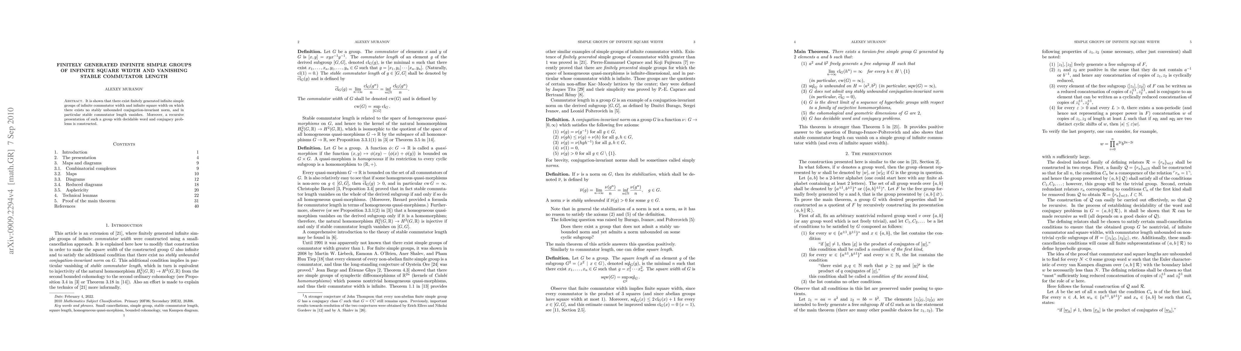Summary: The paper presents finitely generated infinite simple groups with infinite square width and vanishing stable commutator length, and constructs a recursive presentation of such a group with decidable word and conjugacy problems.