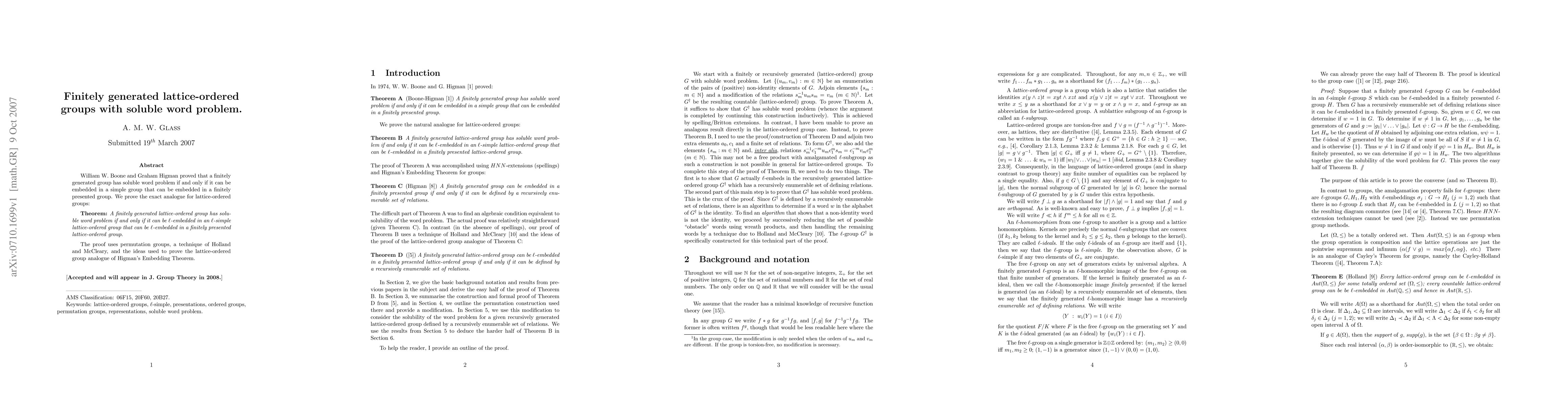 William W. Boone and Graham Higman proved that a finitely generated group has soluble word problem if and only if it can be embedded in a simple group that can be embedded in a finitely presented group. We prove the exact analogue for lattice-ordered groups: Theorem: A finitely generated lattice-ordered group has soluble word problem if and only if it can be embedded in an simple lattice-ordered group that can be embedded in a finitely presented lattice-ordered group. The proof uses permutation groups and the ideas used to prove the lattice-ordered group analogue of Higman's Embedding Theorem.