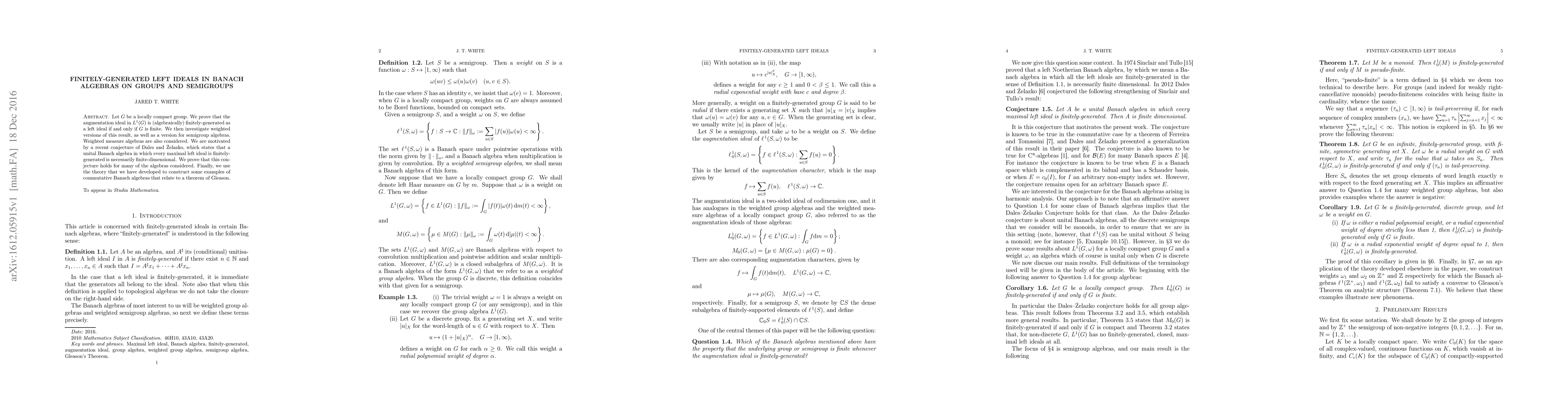 Let $G$ be a locally compact group. We prove that the augmentation ideal in $L^1(G)$ is (algebraically) finitely-generated as a left ideal if and only if $G$ is finite. We then investigate weighted versions of this result, as well as a version for semigroup algebras. Weighted measure algebras are also considered. We are motivated by a recent conjecture of Dales and \.Zelazko, which states that a unital Banach algebra in which every maximal left ideal is finitely-generated is necessarily finite-dimensional. We prove that this conjecture holds for many of the algebras considered. Finally, we use the theory that we have developed to construct some examples of commutative Banach algebras that relate to a theorem of Gleason.