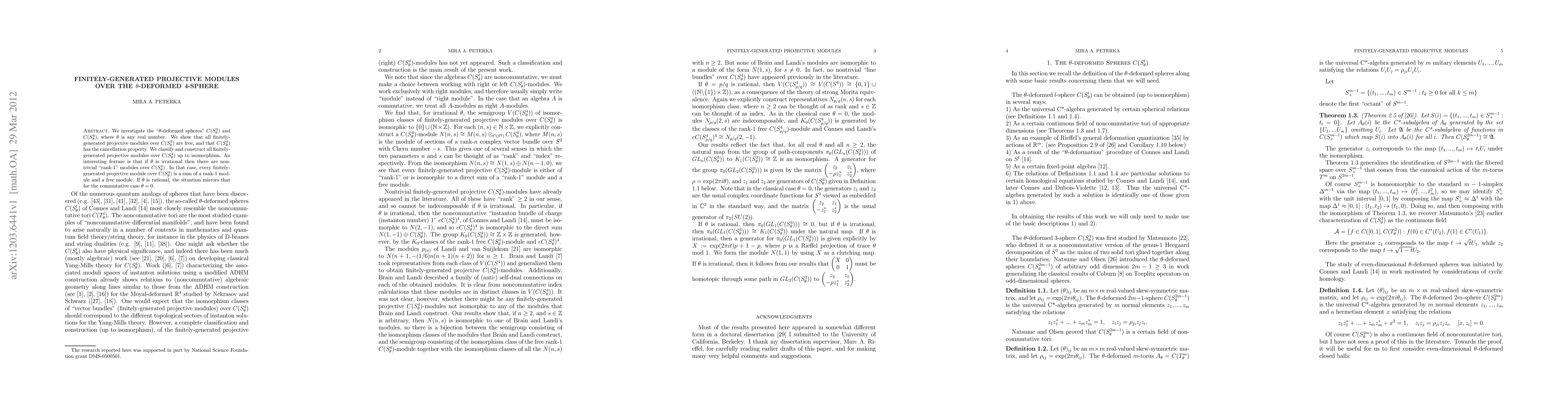 This paper explores finitely-generated projective modules over the "theta-deformed spheres" C(S^{3}_{theta}) and C(S^{4}_{theta}). It finds that all such modules over C(S^{3}_{theta}) are free, while C(S^{4}_{theta}) exhibits the cancellation property and is classified up to isomorphism, revealing nontrivial rank-1 modules when theta is irrational.