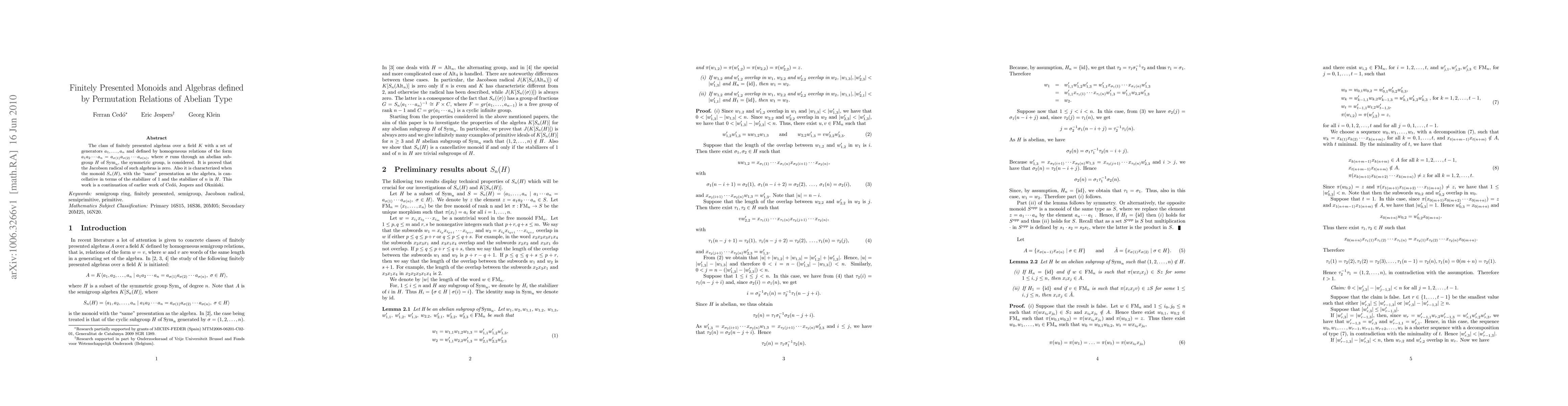 A research paper investigates algebras defined by permutation relations of abelian type, showing that their Jacobson radical is zero. It also characterizes when the monoid associated with these algebras is cancellative under certain conditions.