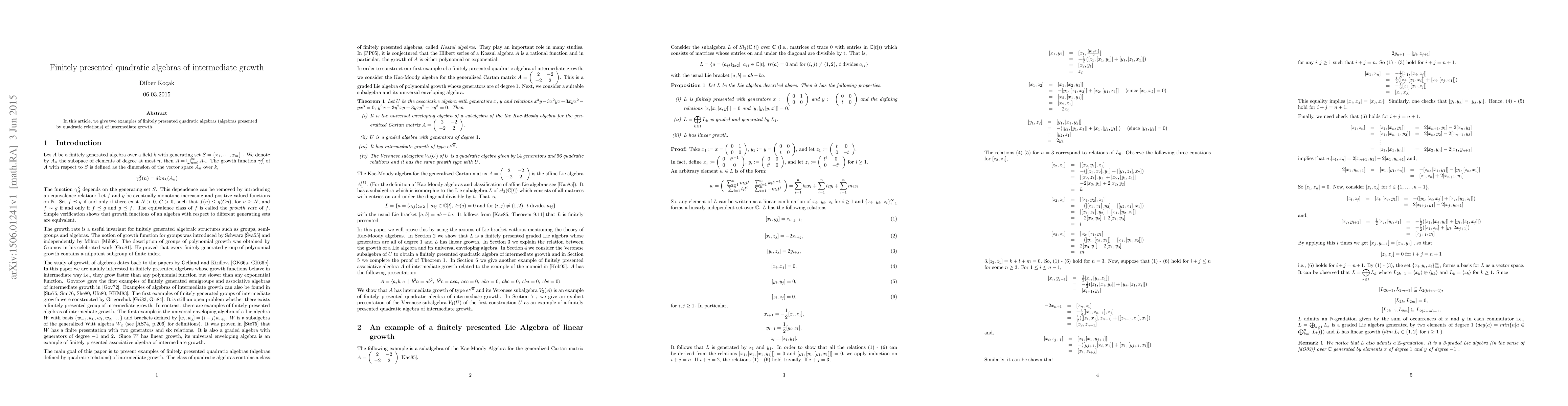 Summary: This paper presents two examples of finitely presented quadratic algebras that demonstrate intermediate growth, illustrating the complexity and growth patterns in such algebraic structures.