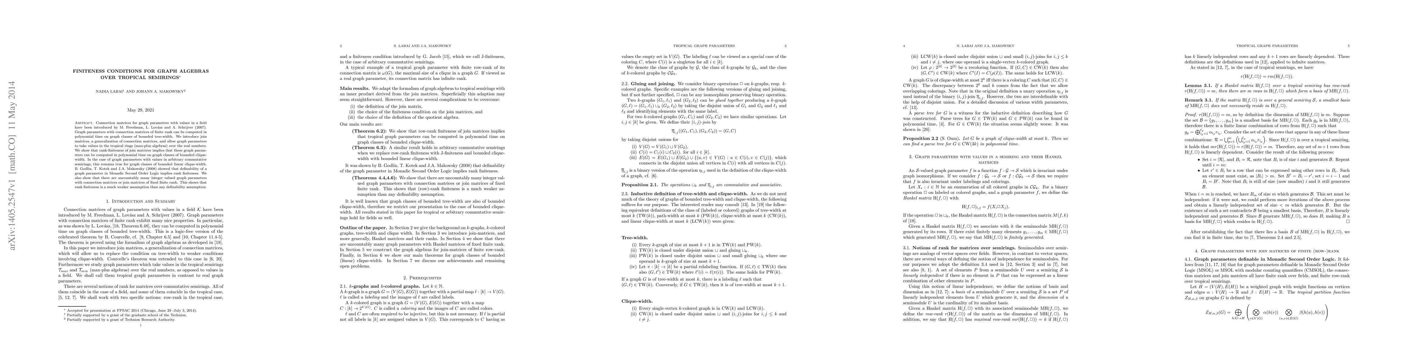 Connection matrices for graph parameters with values in a field have been introduced by M. Freedman, L. Lov{\'a}sz and A. Schrijver (2007). Graph parameters with connection matrices of finite rank can be computed in polynomial time on graph classes of bounded tree-width. We introduce join matrices, a generalization of connection matrices, and allow graph parameters to take values in the tropical rings (max-plus algebras) over the real numbers. We show that rank-finiteness of join matrices implies that these graph parameters can be computed in polynomial time on graph classes of bounded clique-width. In the case of graph parameters with values in arbitrary commutative semirings, this remains true for graph classes of bounded linear clique-width. B. Godlin, T. Kotek and J.A. Makowsky (2008) showed that definability of a graph parameter in Monadic Second Order Logic implies rank finiteness. We also show that there are uncountably many integer valued graph parameters with connection matrices or join matrices of fixed finite rank. This shows that rank finiteness is a much weaker assumption than any definability assumption.