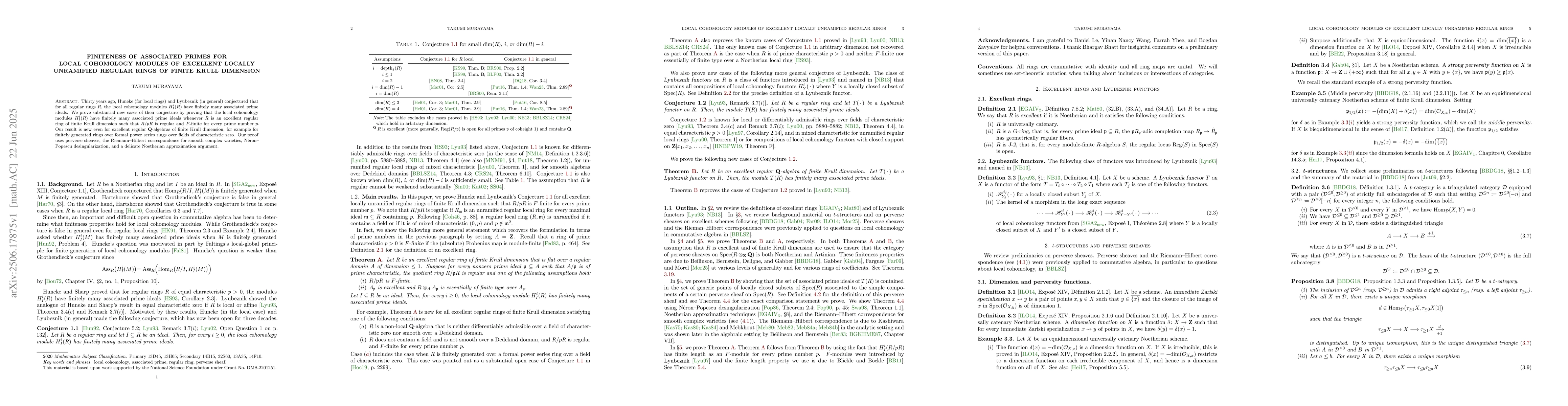 Thirty years ago, Huneke (for local rings) and Lyubeznik (in general) conjectured that for all regular rings $R$, the local cohomology modules $H^i_I(R)$ have finitely many associated prime ideals. We prove substantial new cases of their conjecture by proving that the local cohomology modules $H^i_I(R)$ have finitely many associated prime ideals whenever $R$ is an excellent regular ring of finite Krull dimension such that $R/pR$ is regular and $F$-finite for every prime number $p$. Our result is new even for excellent regular $\mathbf{Q}$-algebras of finite Krull dimension, for example for finitely generated rings over formal power series rings over fields of characteristic zero. Our proof uses perverse sheaves, the Riemann-Hilbert correspondence for smooth complex varieties, N\'eron-Popescu desingularization, and a delicate Noetherian approximation argument.