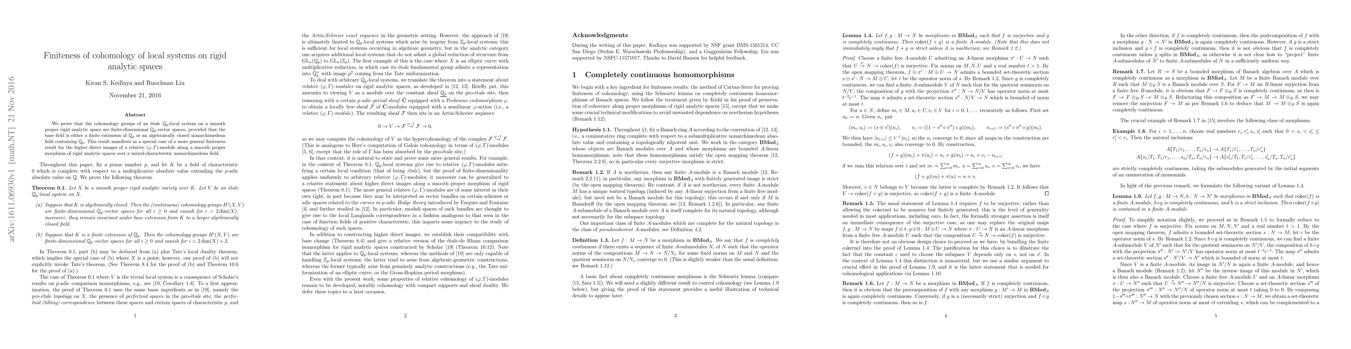 The paper proves that the cohomology groups of a Q_p-local system on smooth proper rigid analytic spaces are finite-dimensional Q_p-vector spaces under certain base field conditions. This result extends to finiteness of higher direct images of relative (phi, Gamma)-modules in mixed-characteristic nonarchimedean fields.
