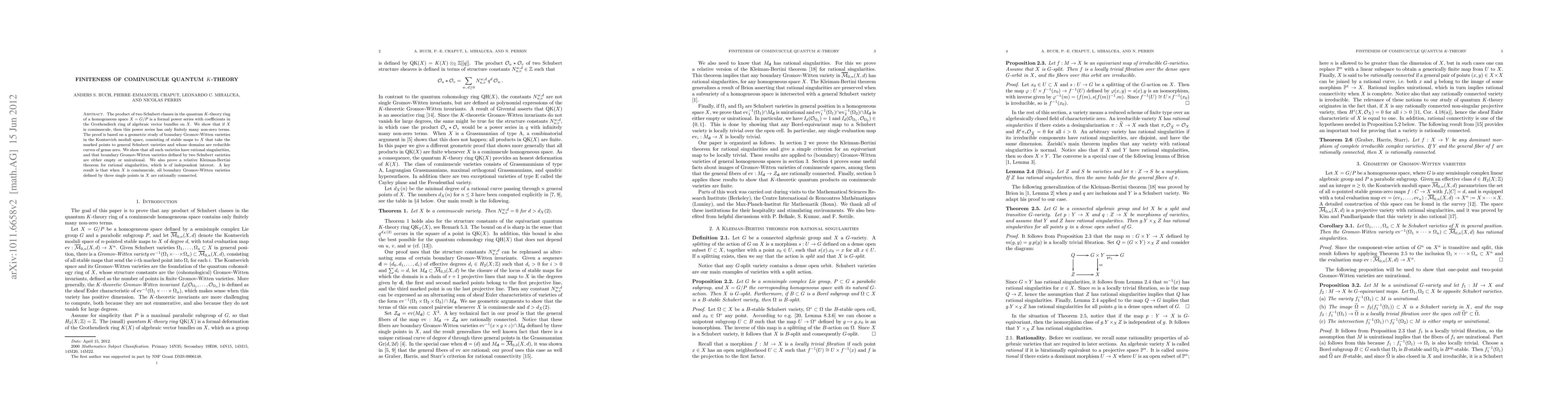 This paper demonstrates the finiteness of non-zero terms in the product of two Schubert classes in the quantum K-theory of cominuscule homogeneous spaces. The proof leverages a geometric study of boundary Gromov-Witten varieties, showing they have rational singularities and are either empty or unirational.
