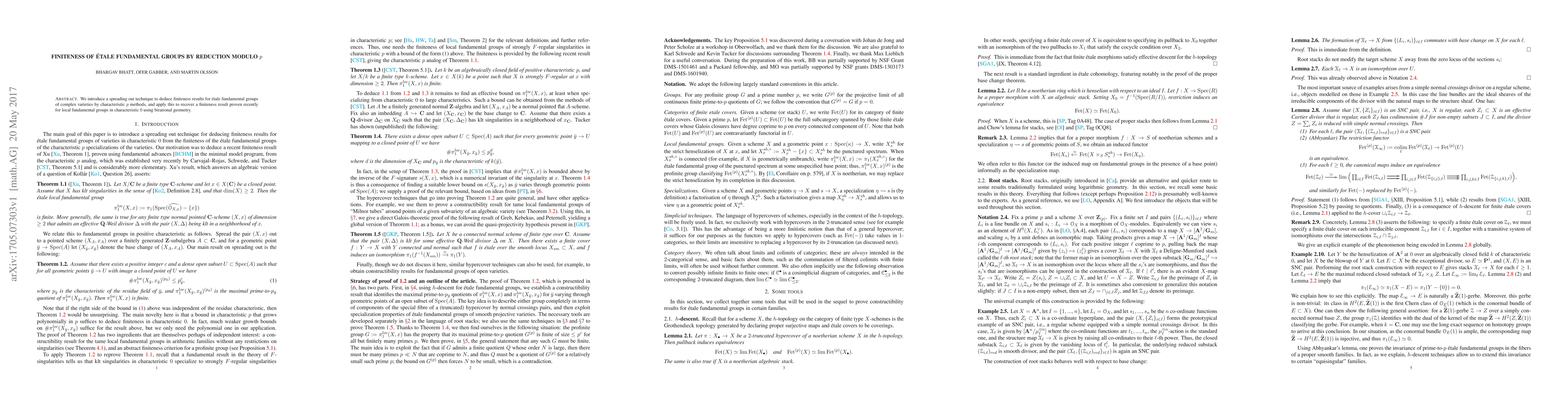 We introduce a spreading out technique to deduce finiteness results for \'etale fundamental groups of complex varieties by characteristic $p$ methods, and apply this to recover a finiteness result proven recently for local fundamental groups in characteristic $0$ using birational geometry.