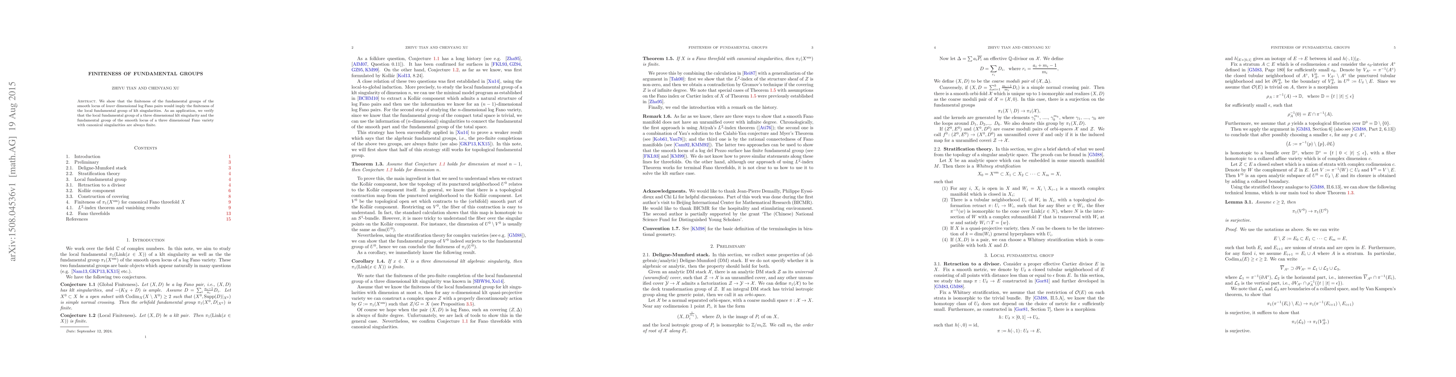 This paper demonstrates that the finiteness of fundamental groups in the smooth regions of lower-dimensional log Fano pairs leads to the finiteness of local fundamental groups of klt singularities. It concludes by proving the finiteness of the local fundamental group for three-dimensional klt singularities and the fundamental group for smooth regions of three-dimensional Fano varieties with canonical singularities.