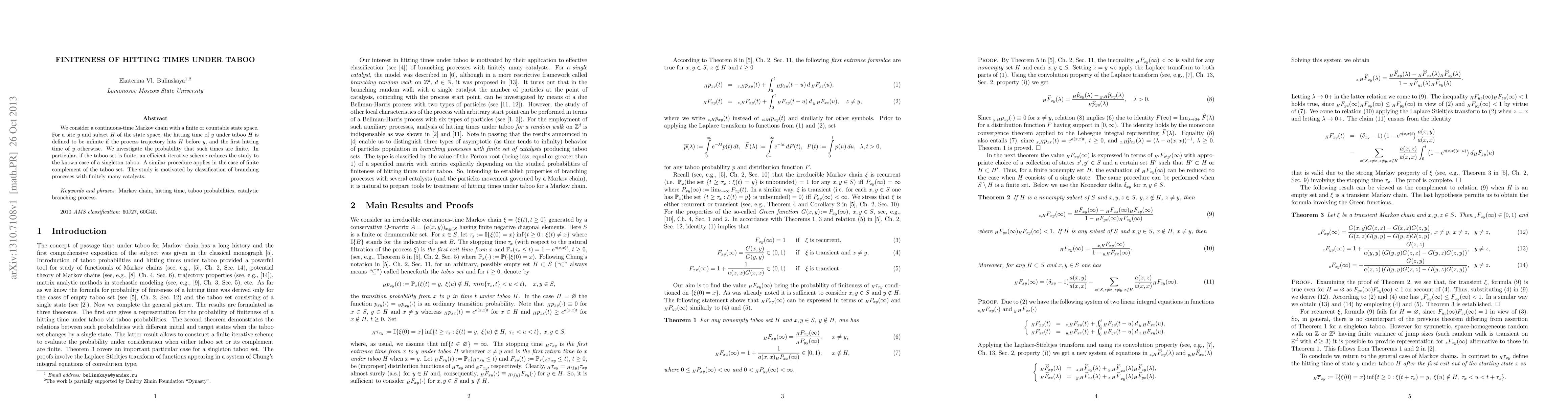 This paper examines the finiteness of hitting times in a continuous-time Markov chain when a subset of states is taboo, focusing on the probability that the chain hits a specific site before entering the taboo set. It proposes efficient iterative methods for finite taboo sets and complements, motivated by applications in classifying branching processes with catalysts.