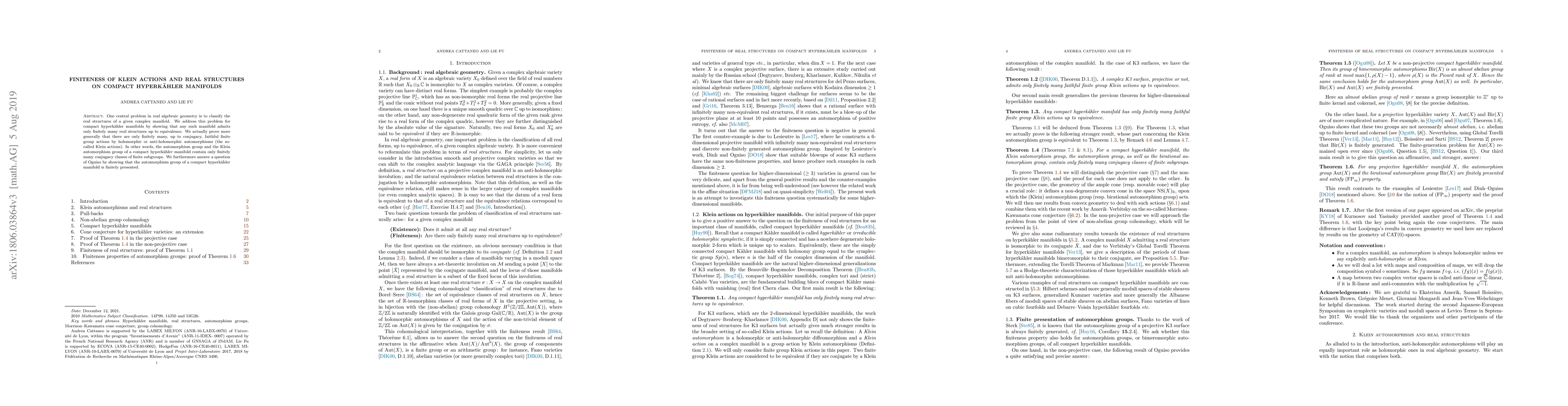 This paper demonstrates that compact hyperkähler manifolds have only finitely many real structures and finite group actions, up to equivalence and conjugacy respectively. It also proves that the automorphism group of such manifolds is finitely presented, addressing a question posed by Oguiso.
