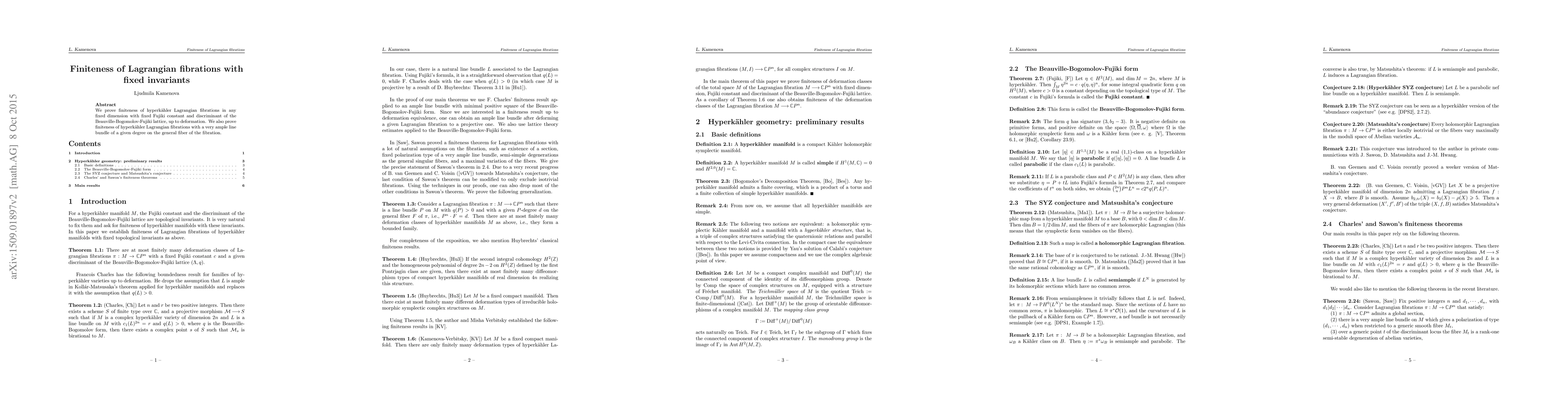 This paper establishes the finiteness of hyperkähler Lagrangian fibrations in a fixed dimension, constrained by a set of invariants including Fujiki constant, discriminant, and a specific ample line bundle degree on the general fiber, up to deformation. The results hold for fibrations in any dimension with these fixed invariants.