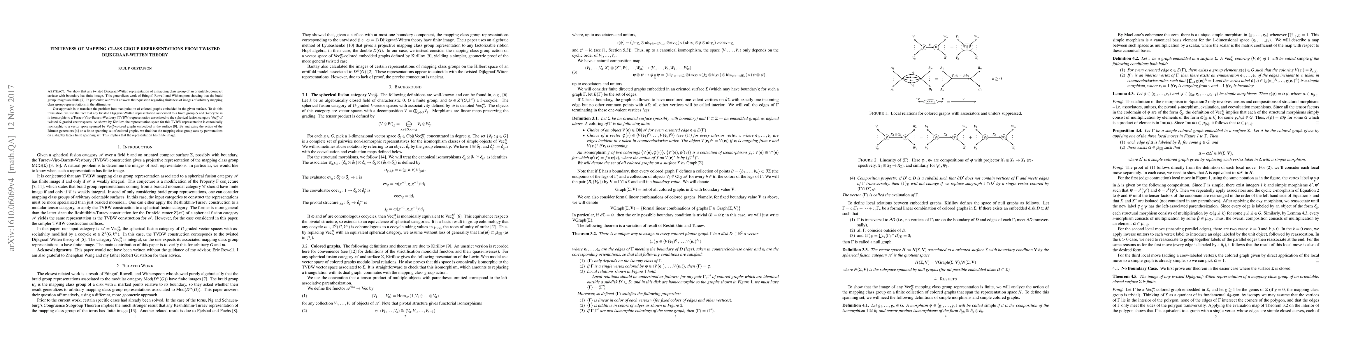 The paper demonstrates that twisted Dijkgraaf-Witten representations of mapping class groups on orientable surfaces have finite images, generalizing previous results for braid groups. It uses colored graph manipulations and TVBW representations to show that the image of these representations is finite.