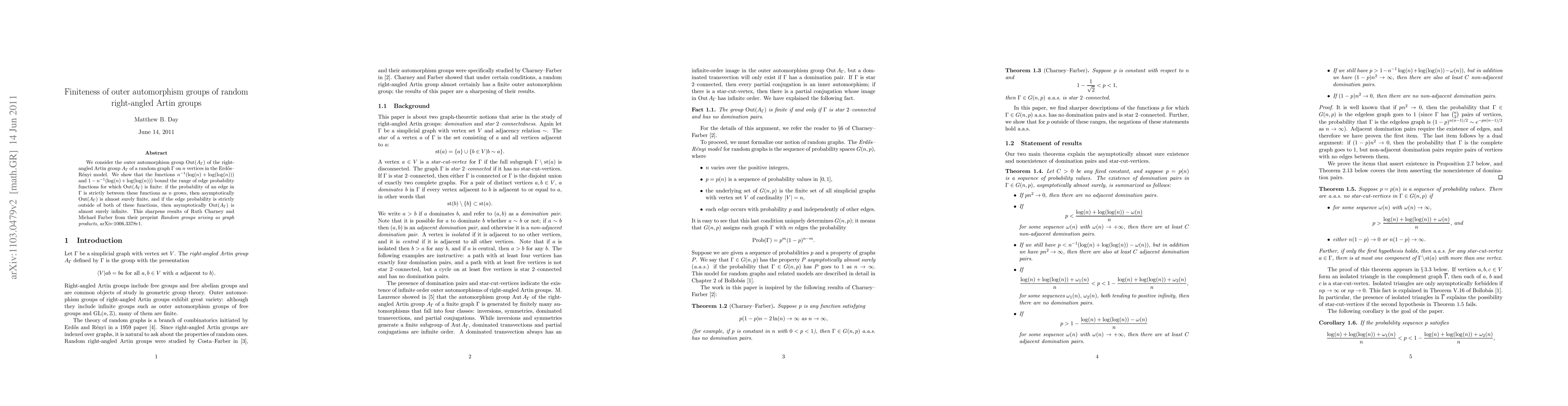 Research shows that the outer automorphism group of a random right-angled Artin group is almost surely finite if edge probabilities fall within a specific range as n grows, otherwise it's almost surely infinite.