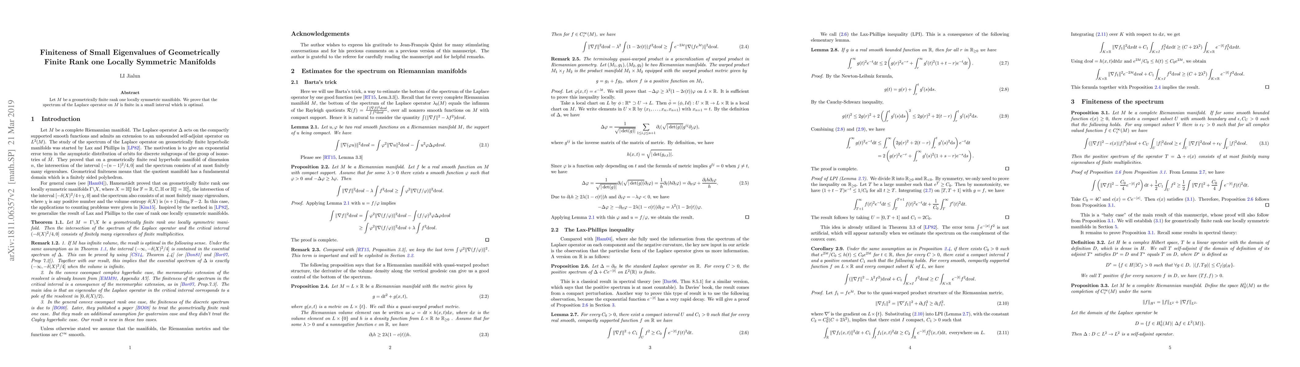 Summary: This paper proves that the spectrum of the Laplace operator on geometrically finite rank one locally symmetric manifolds M is finite in a small, optimal interval. This result establishes the finiteness of small eigenvalues for such manifolds.
