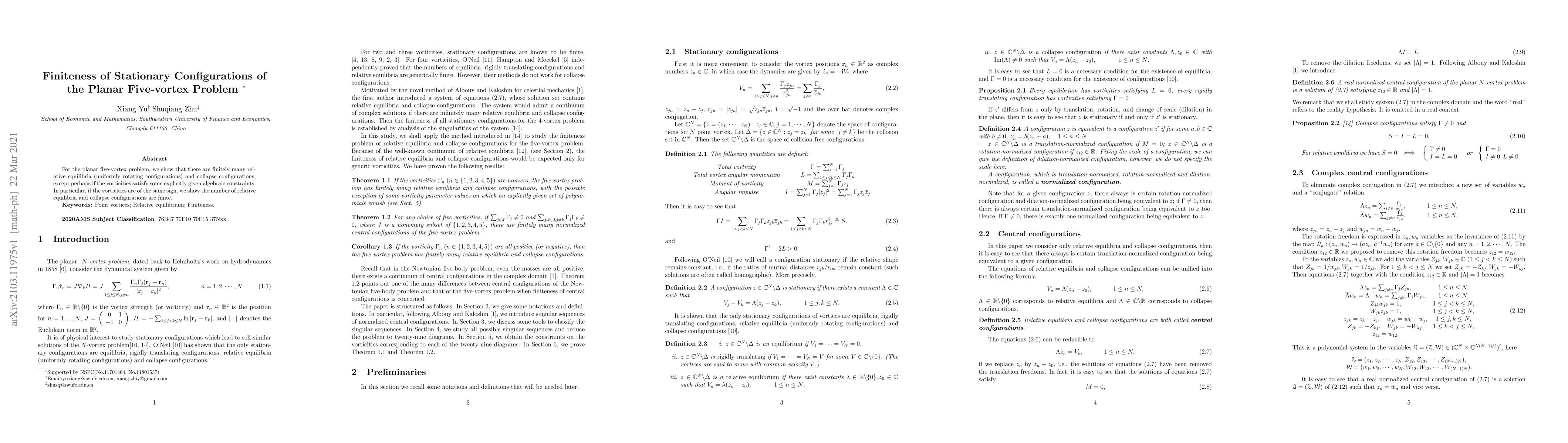 Summary: This paper demonstrates that the planar five-vortex problem has a finite number of stationary configurations, specifically relative equilibria and collapse configurations, unless certain algebraic constraints on vorticities are met. Vortices of the same sign guarantee a finite count of these configurations.