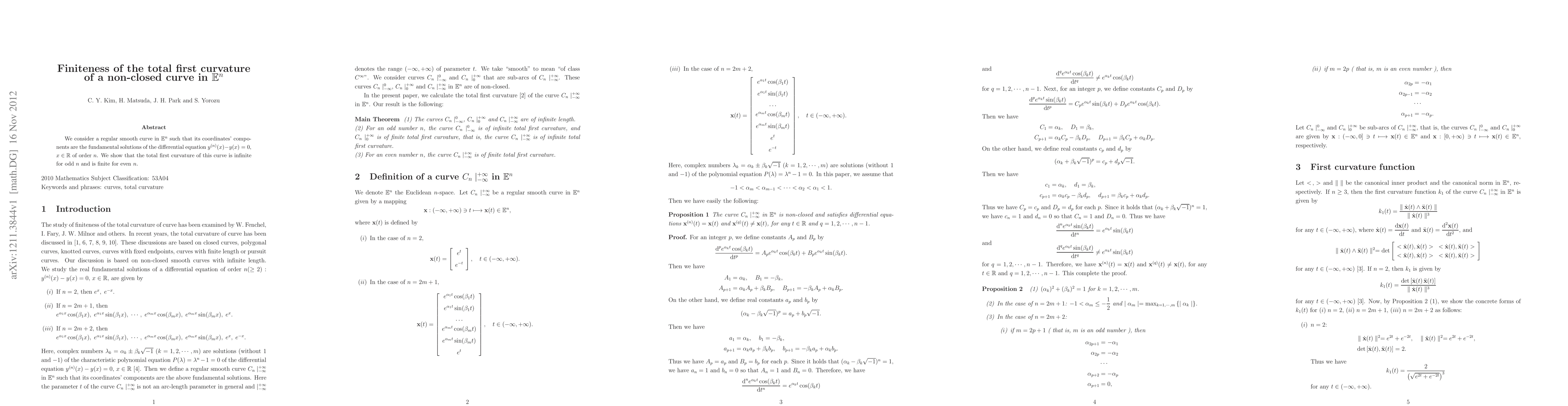 We consider a regular smooth curve in $\mathbb{E}^n$ such that its coordinates' components are the fundamental solutions of the differential equation $ y^{(n)} (x) - y(x) = 0 ,$ $x \in \mathbb{R} $ of order $n$. We show that the total first curvature of this curve is infinite for odd $n$ and is finite for even $n$.